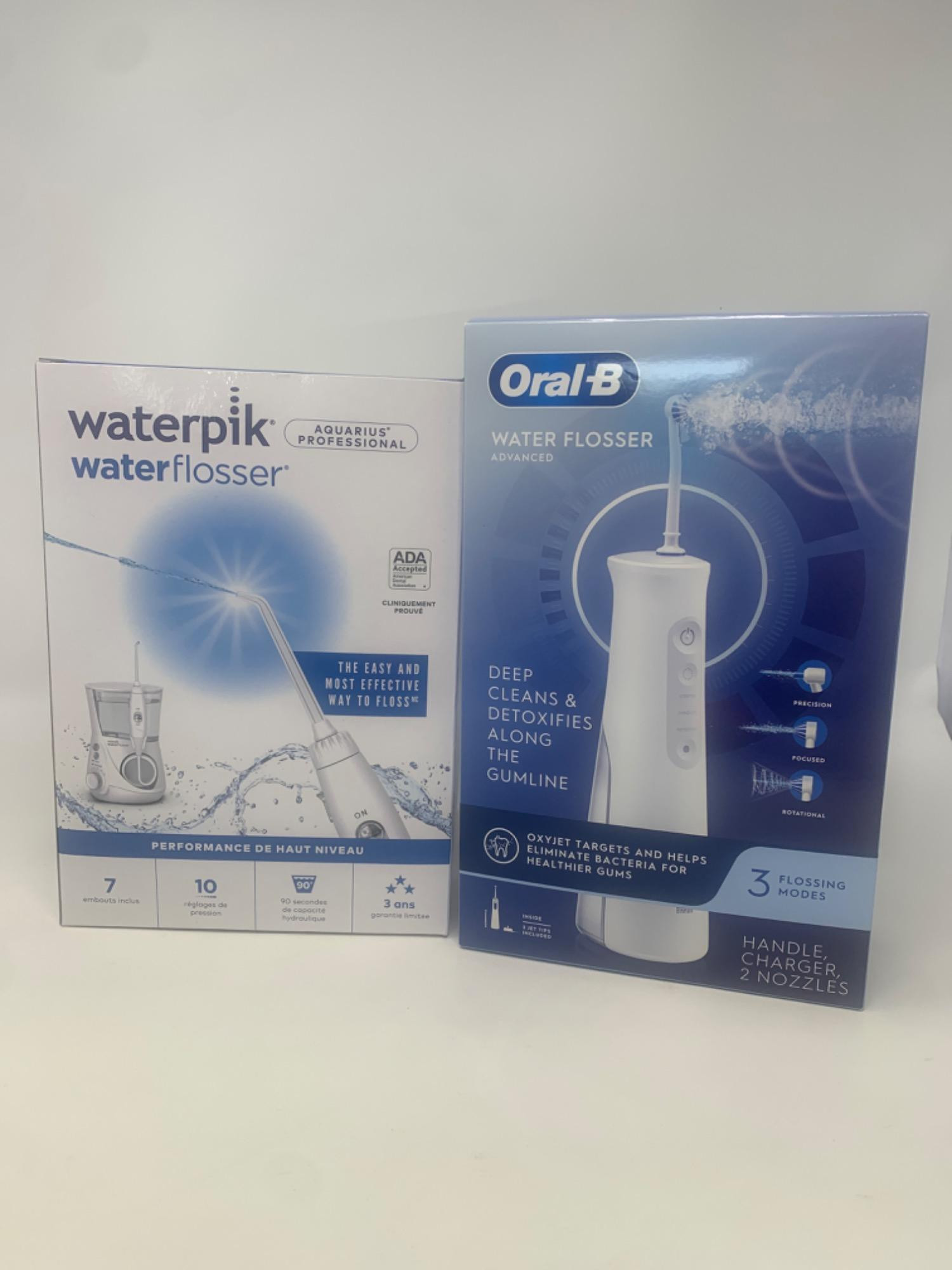 Two water flossers you have been meaning to buy. Here is your chance for improved dental health and pearly white smiles. New in the Box. One is great travel size. One has multiple piks and settings.