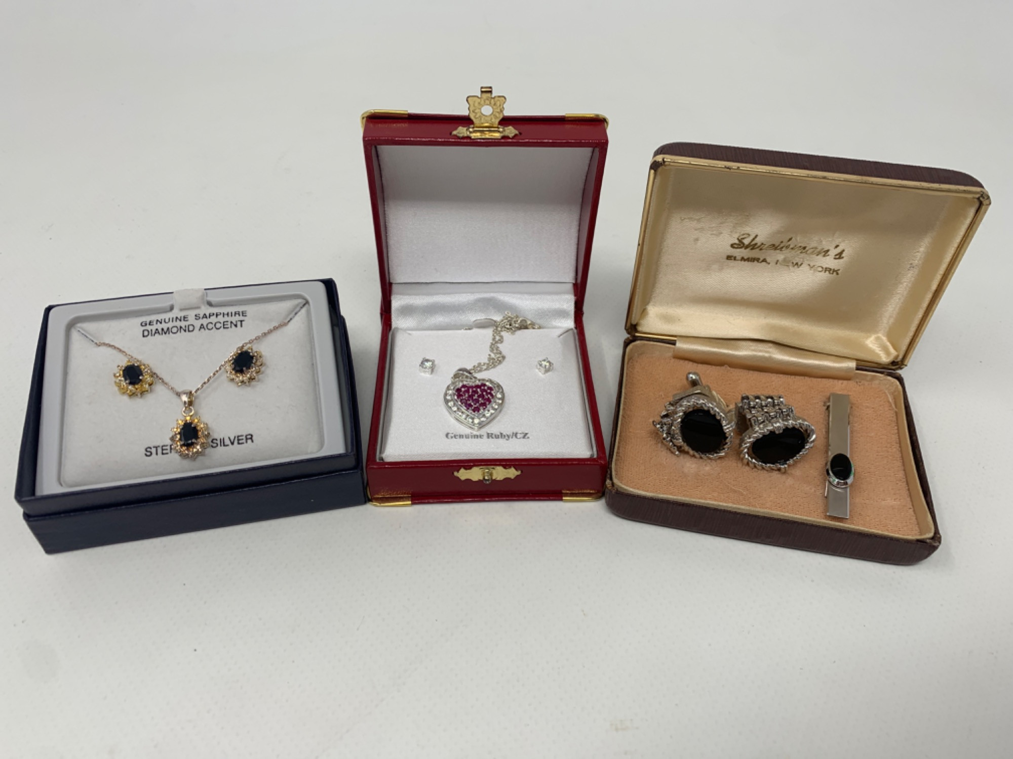 Set of new silver cufflinks. Sterling silver genuine, ruby, and cubic zirconia necklace, and earring set. Sapphire with diamond accent sterling silver necklace and earring set. Weight is 13grams.