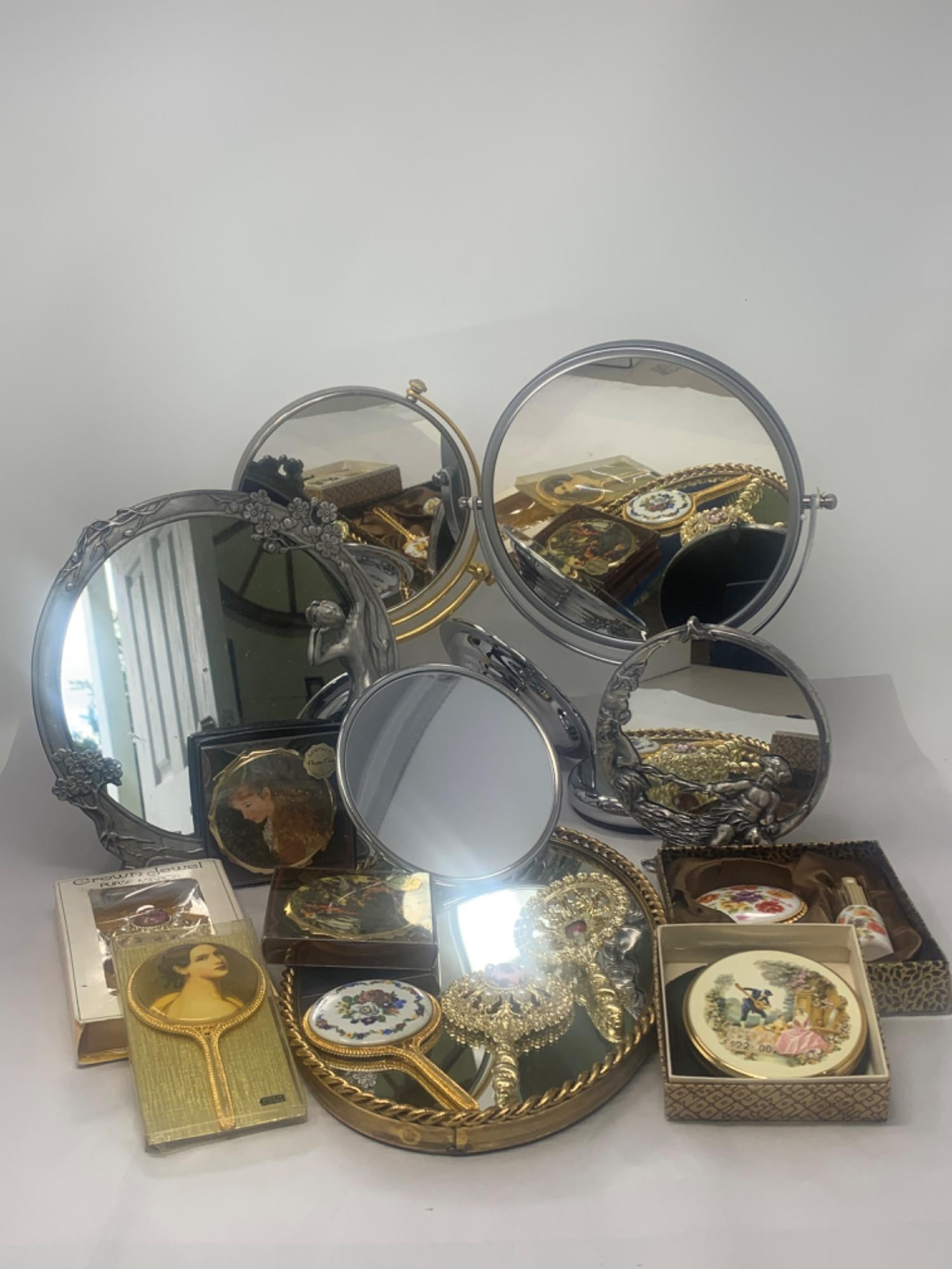 Huge lot of mirrors for purse or tabletop. Some are magnifying, double sided and swivel. Glass tray and NIB compact mirrors. Variety of styles and sizes.