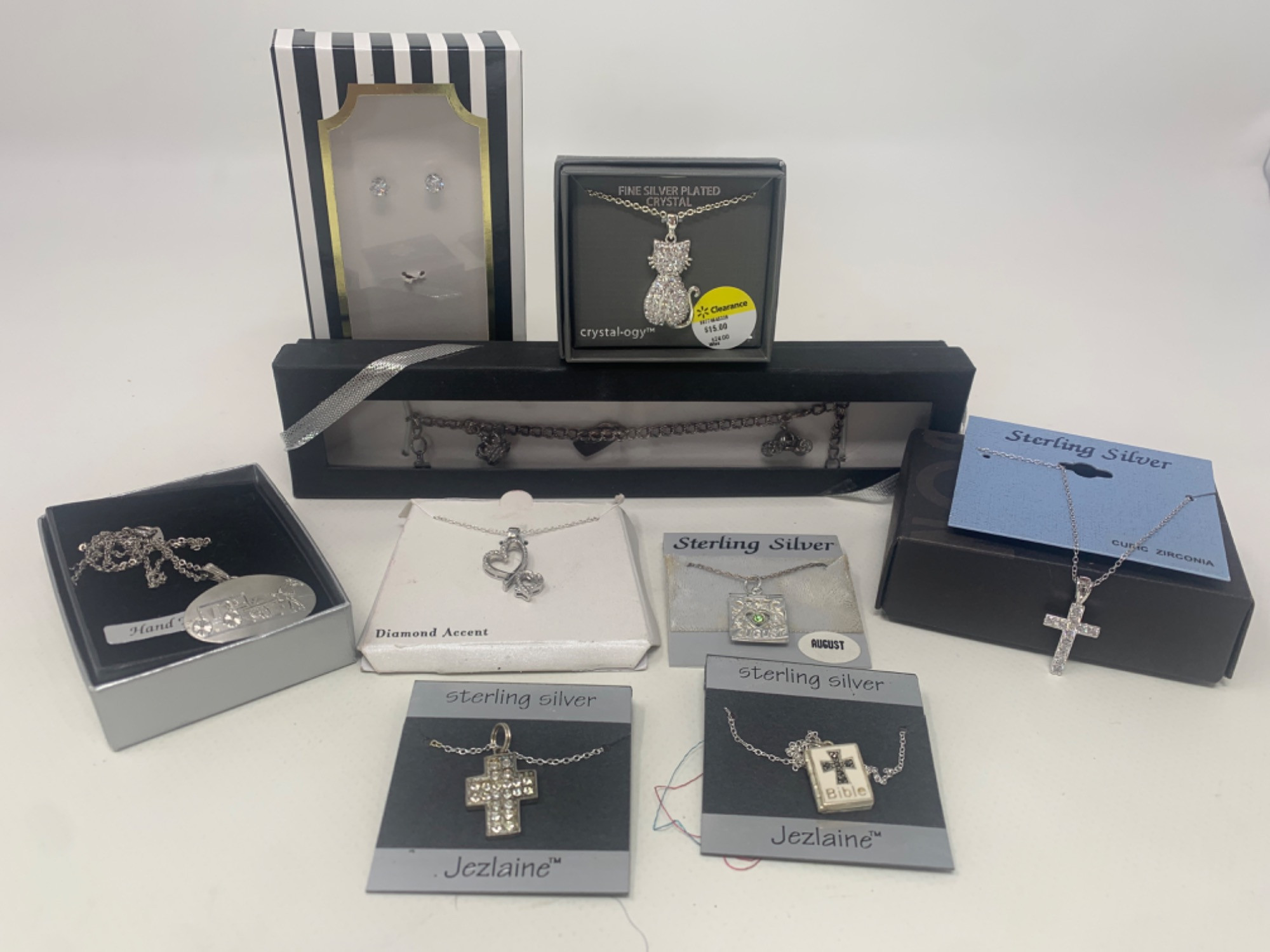 Cubic zirconia earrings. Sterling silver chains and pendants. Sterling silver charm bracelet. One charm is enamel coated. Etched pewter pendant and silver chain. Weight is unknown due to packaging.