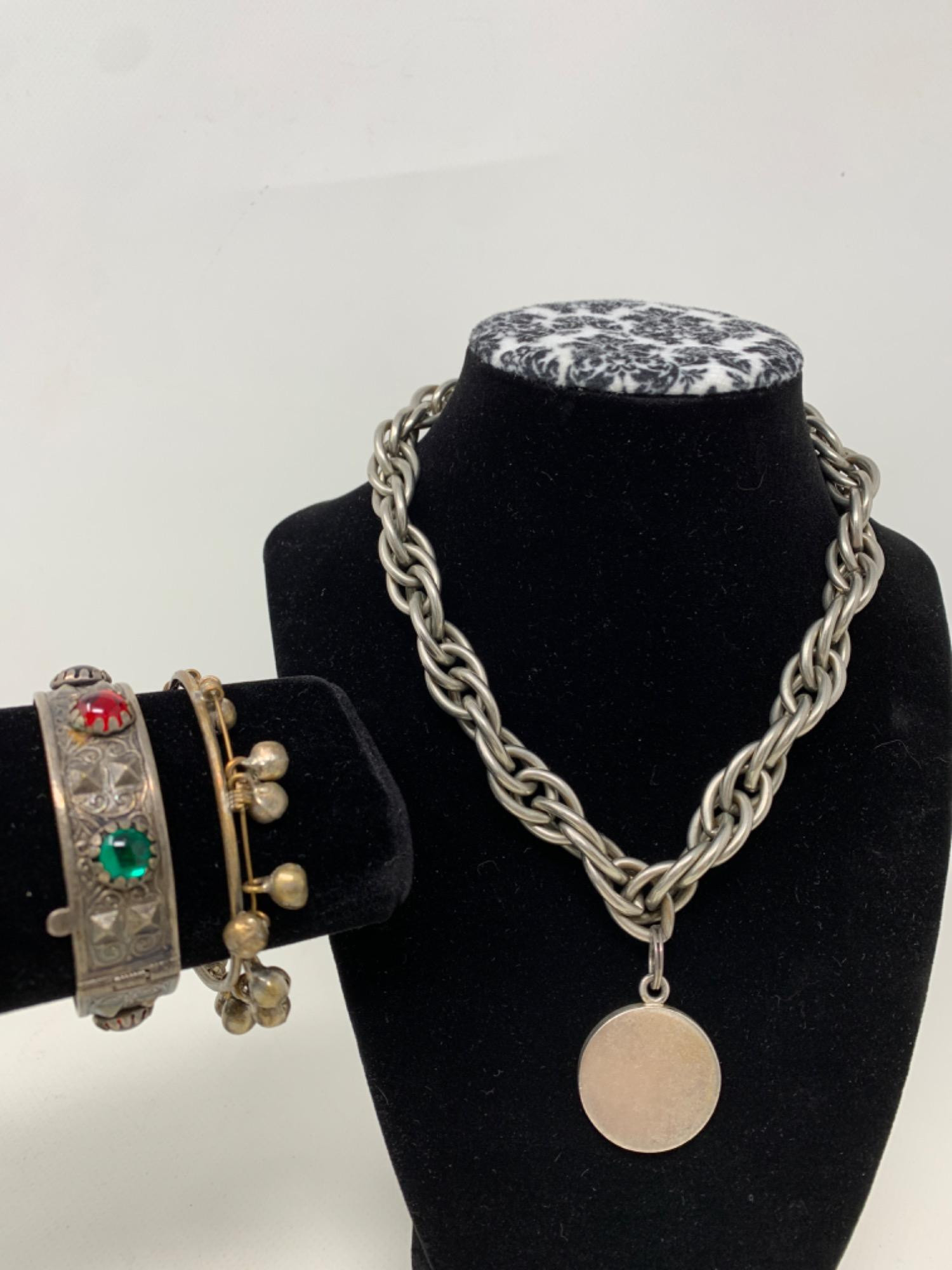 Heavy sterling Napier rope necklace with pendant. Vintage bracelets with bells and gemstones. Weight is 68g. Did not include large rope necklace, only the pendant. Chain could not be verified.