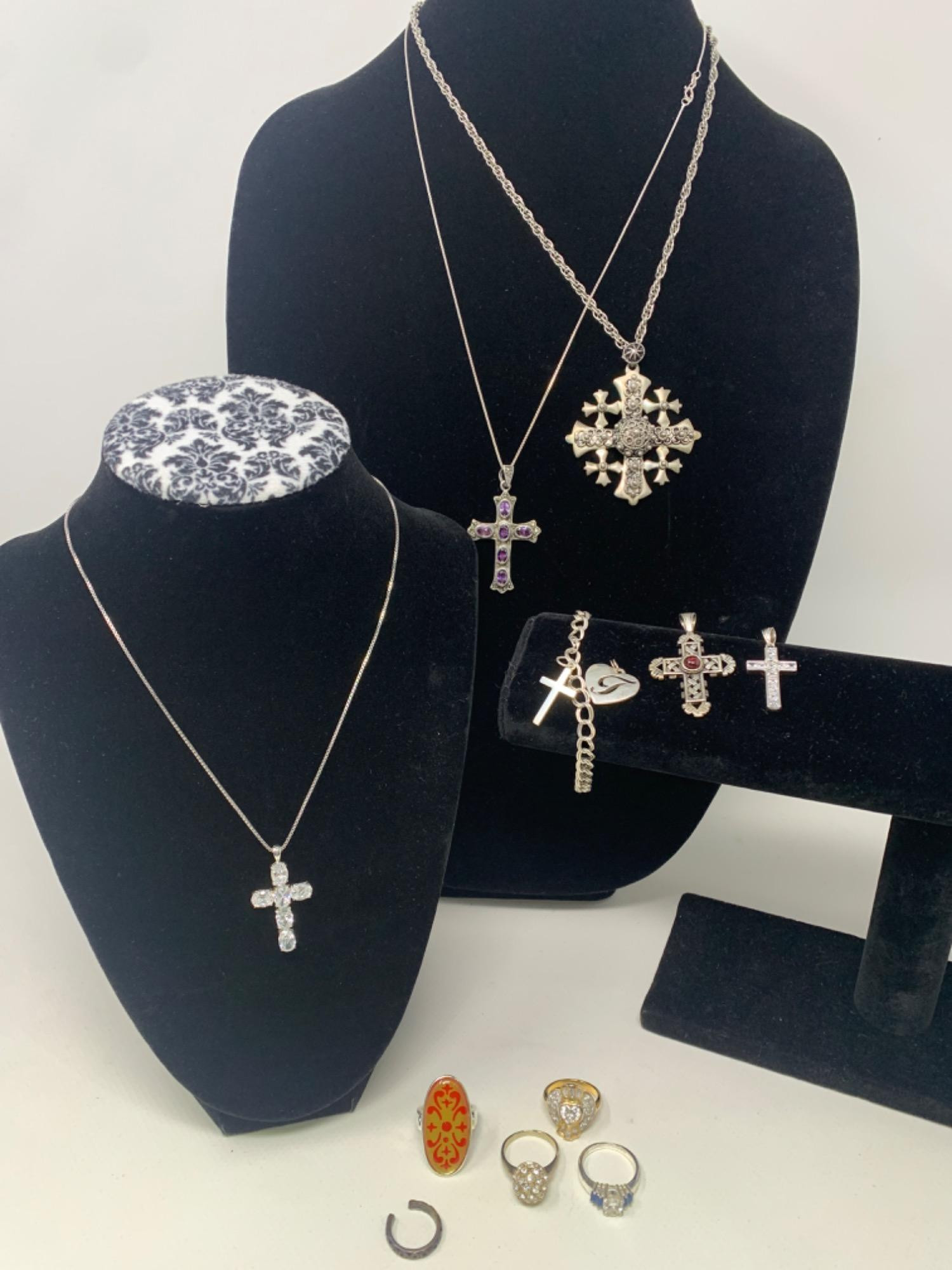 Four sterling silver rings with gemstones. One smaller vintage ring. Three loose pendants. Bracelet with crucifix. Three necklaces with crucifixes. Variety of styles. Ring sizes are 3,7, 6.5. Weight is 96grams.