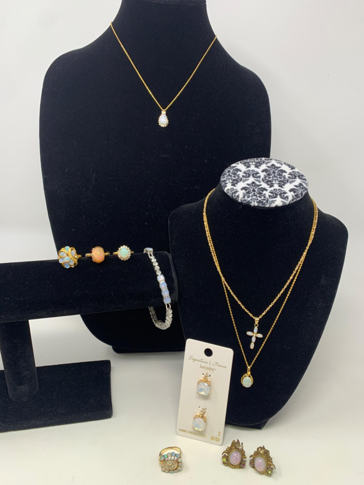 Charming opal, gemstone and gold styled collection. Most are costume jewelry Ring sizes are 5.5, 7, 8.5. Two are 18 karat gold HGE. Vintage clip-on earrings. New Pendants. Updated: Crucifix necklace is plated with 14K gold chain. Real opal ring (with sizer) is 14K gold. May have some fissures
