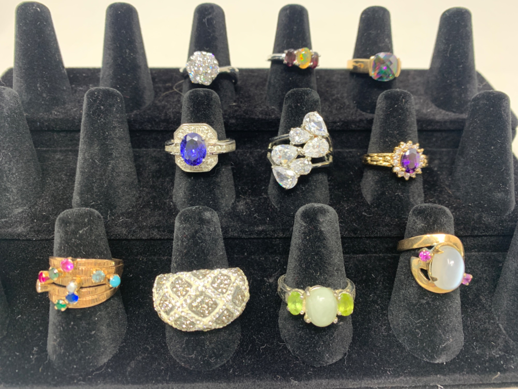 10 rings of varying sizes and styles. Nice quality with gemstones. Sizes are 5.5, 8.5, 8, 7.5, 9, 6.5. Five rings weight is 24g. Four are sterling. Updated: Stacked ring is 14k. 5 grams. Moonstone ring is 14K