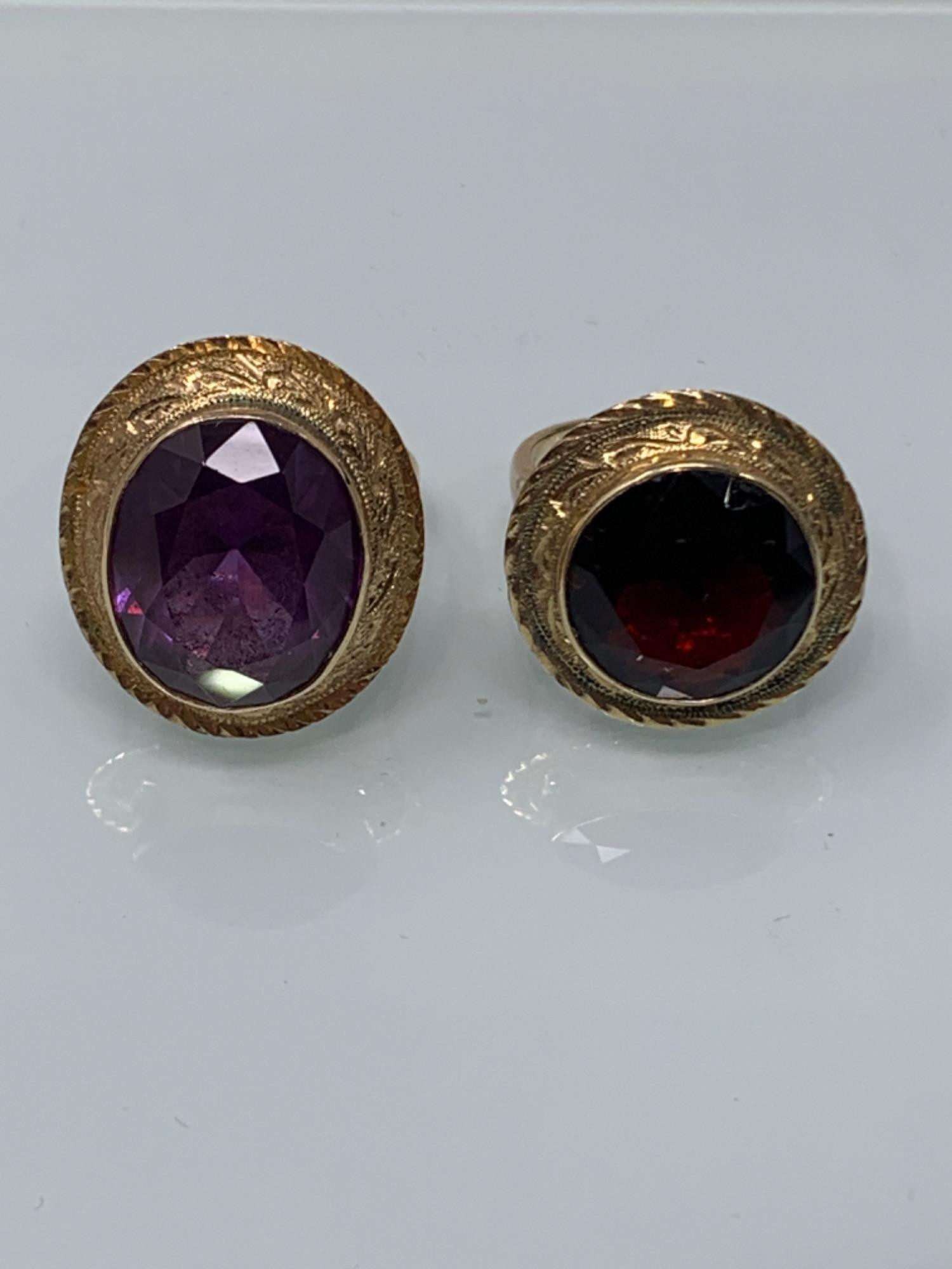 Ring sizes are 5 and 5.5. Ring mounts are very similar, but different shapes. One stone is purple, and the other is red. Weight is 15grams. Intricately carved mount. (jeweler inspected and gold tested at 14K)