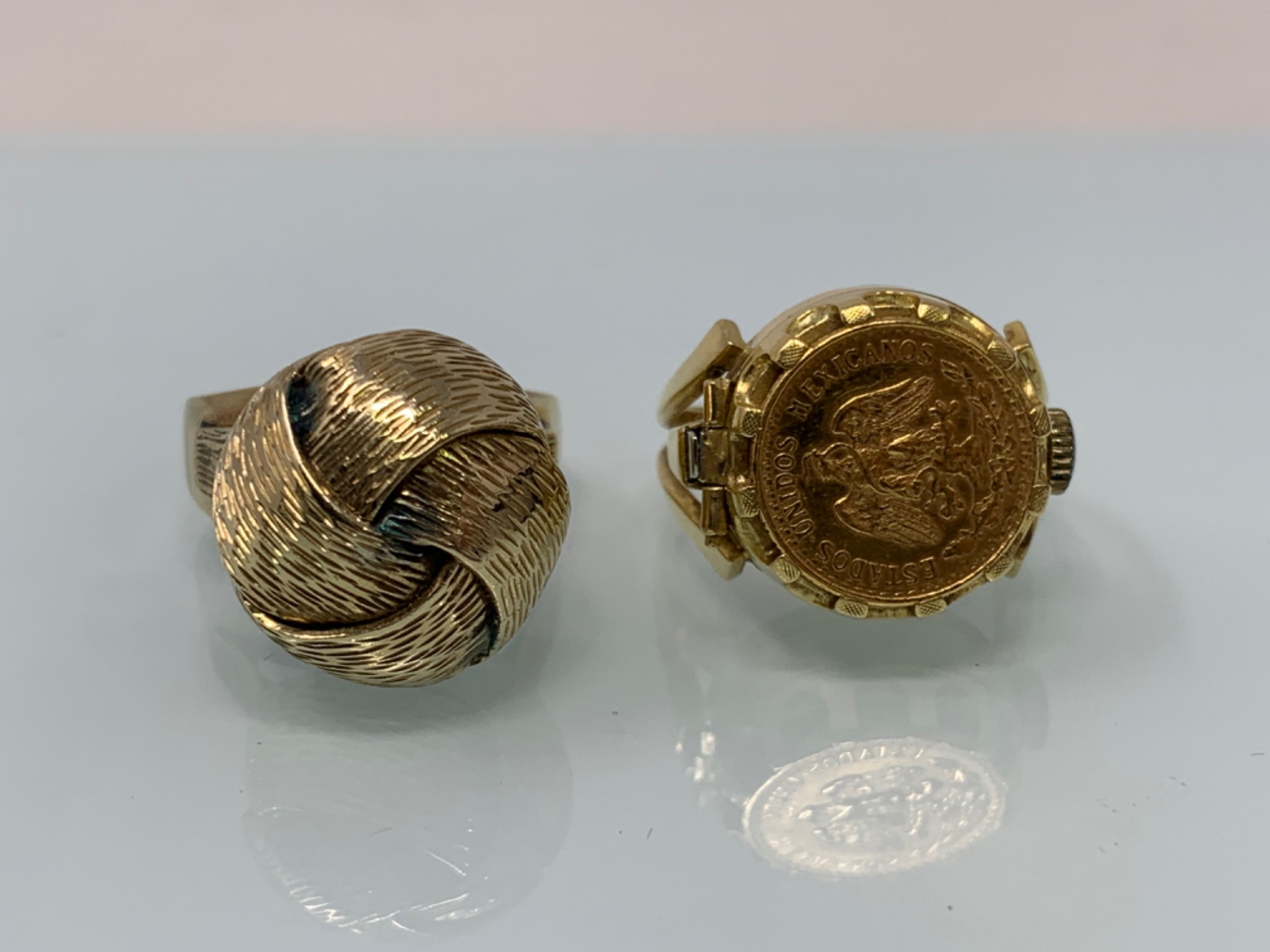 Sizes are 5,6. One ring as flip top to reveal watch. Incabloc Emka Geneva watch. .750 stamped EZP Weight is 19grams. Update: Both rings are 18K. Watch has plated face with Peso coin.