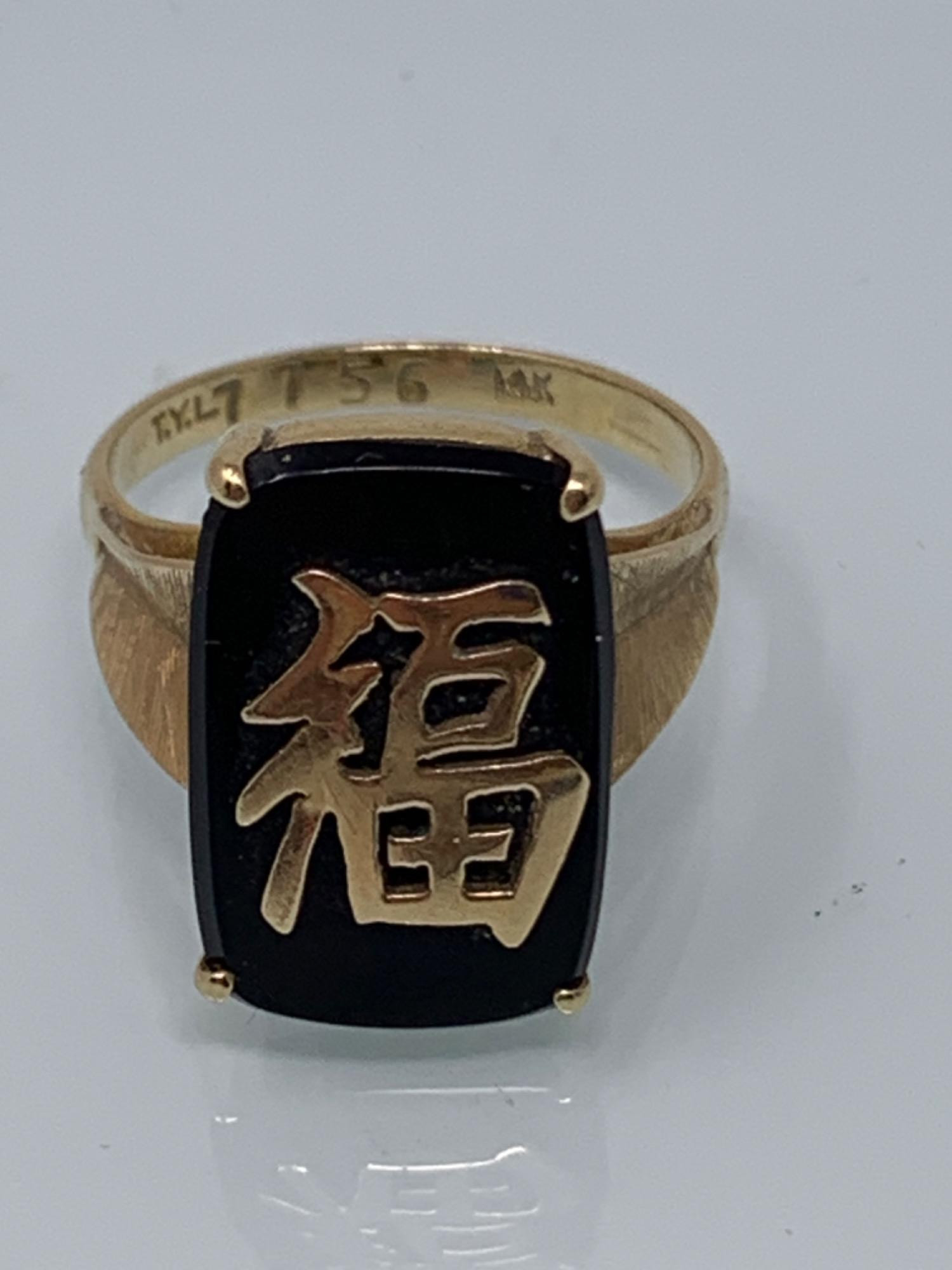 14 karat gold ring with Oriental script on black onyx cabochon base. Size is 6. Weight is 4grams.