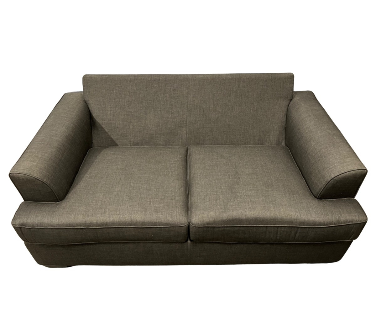 Made by Wanek Furniture, Vietnam, and distributed by Ashley Furniture. Modern two seat sofa in a twill dark grey color. Seat cushions have hideaway zippers. One cushion cover has a dark bluish colored stain on it about 1.5" round. Add your own back accent cushions (there is no back cushion that matches the seat cushions), so this one is ready for you to create your own look. Minor signs of wear. See pictures. Bidding on this lot is an agreement that: (1.) You