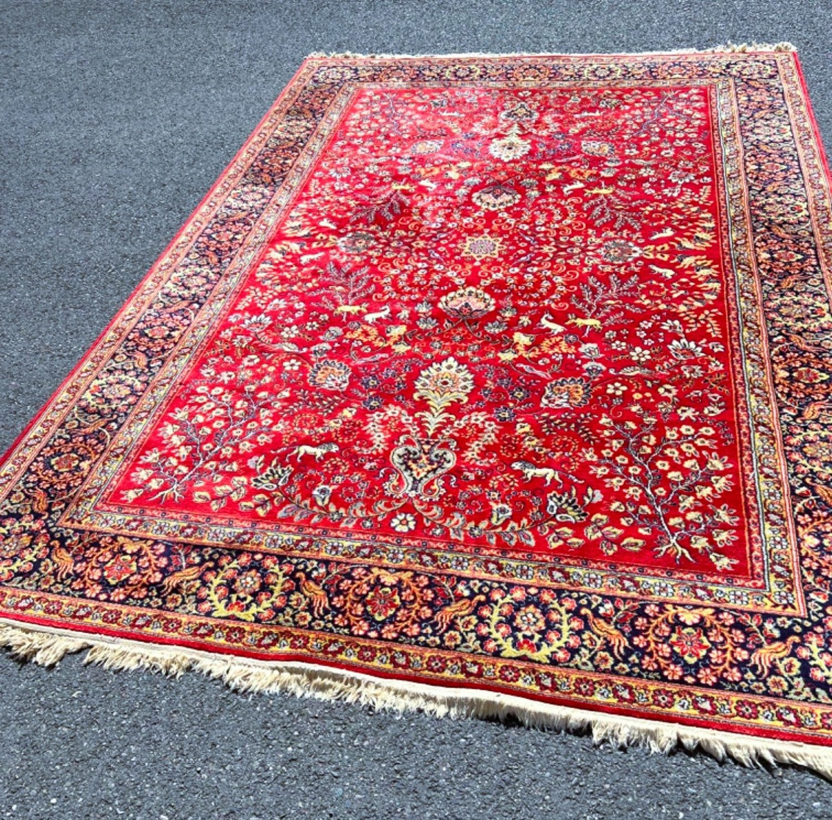 Large rug that measures 136" x 98" without fringe. Wild animal design. Rug is handwoven and possibly from Germany circa 1940's.