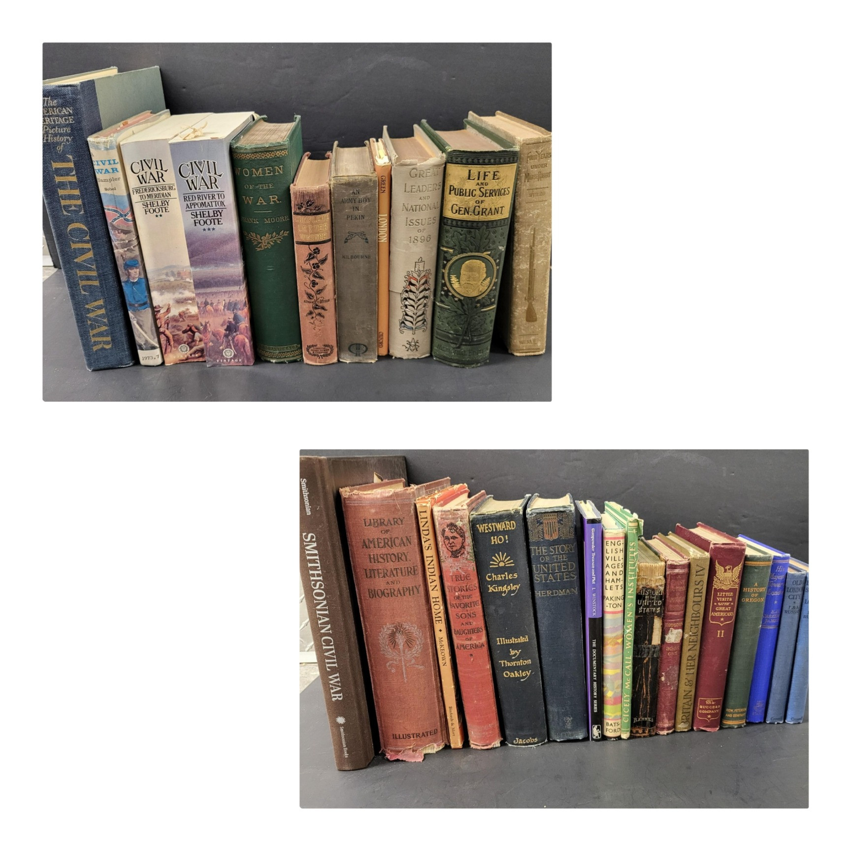 Over 25 vintage & antique hardback and paperback books with various titles on The Civil War, General Grant, Great Leaders, Women of the War, Historical Streets of London, History of Oregon, The Story of the United States and much more. A few are late 1800's, 1920's and newer.