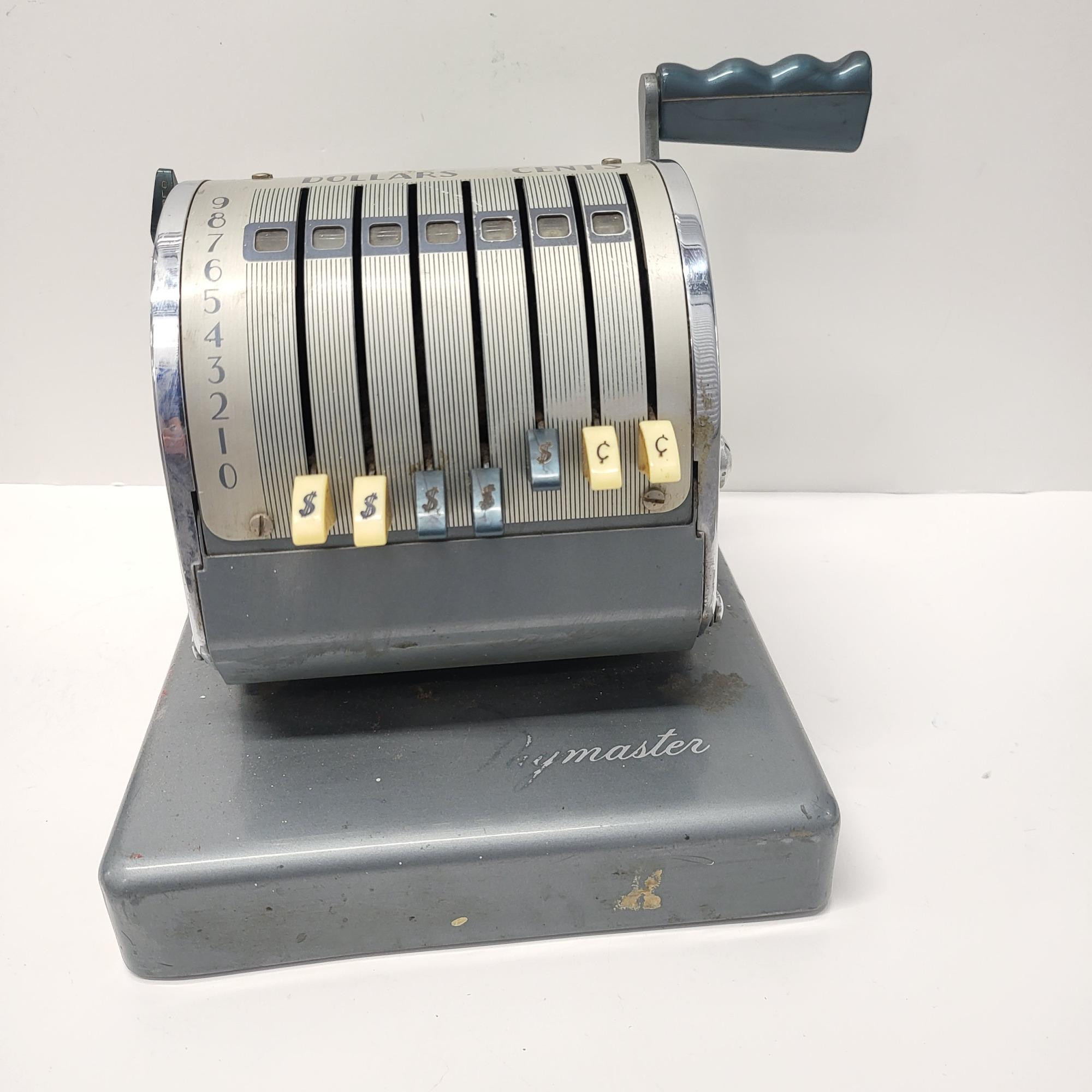Vintage Paymaster Series T-550 check writing machine. Measures 7.5" long x 7" tall x 9" deep.