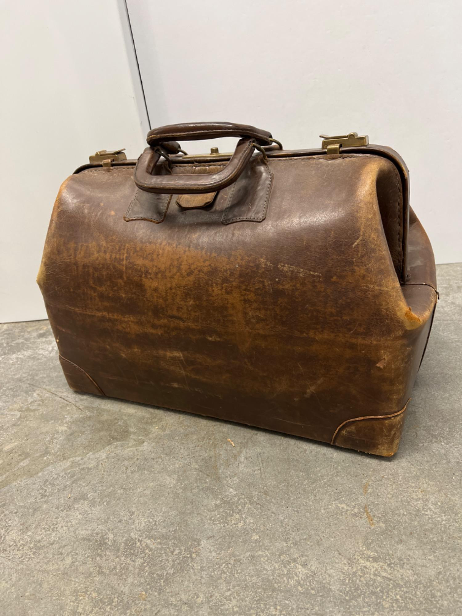 Leather satchel doctor’s often used in the early 1900’s. No key. Bag is 18” long x 10” wide x 12” tall.