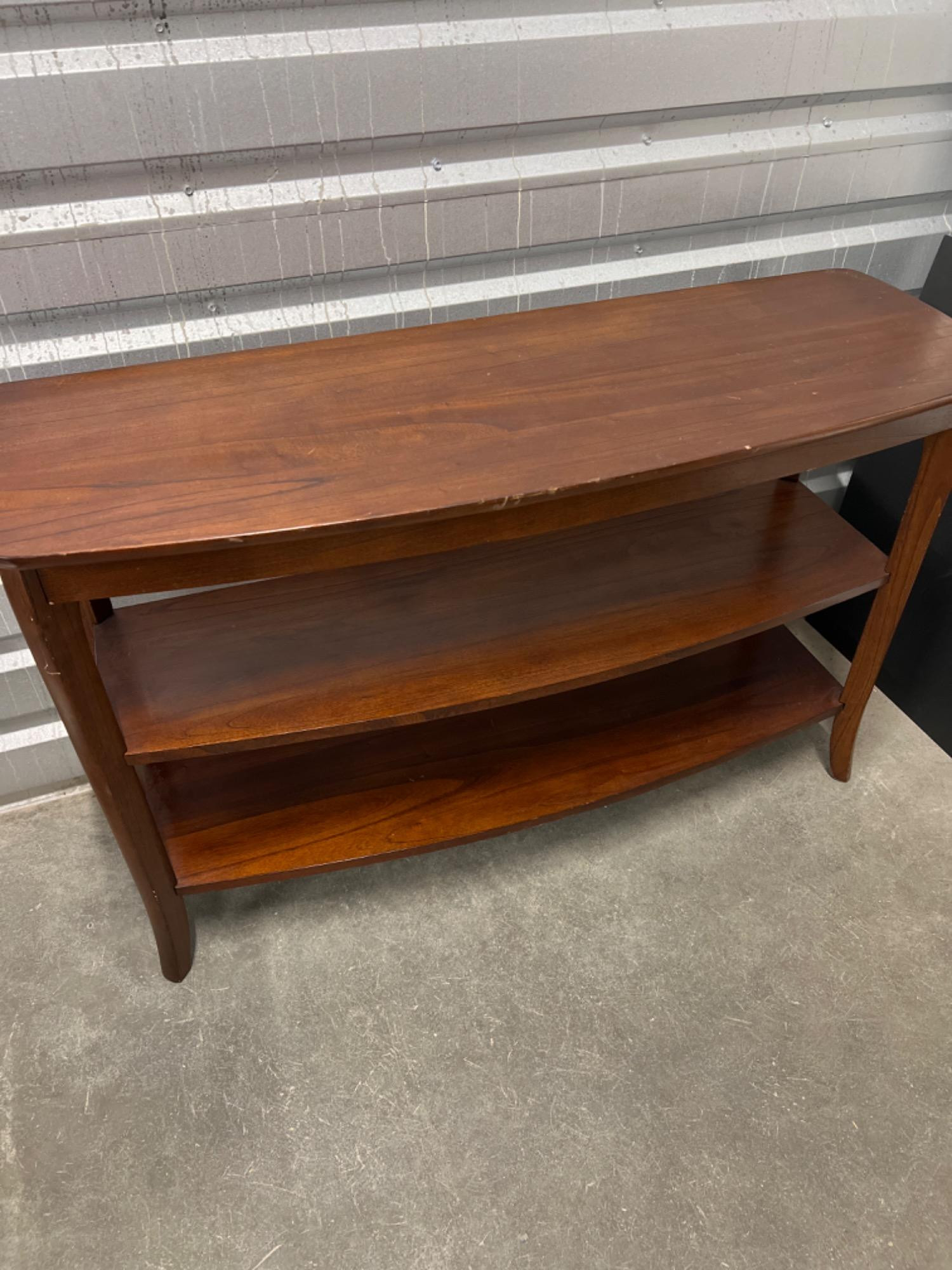 Three-tiered service table made in Vietnam by Outlook International Company. Table 46.5” long x 16” wide x 30.25” height.