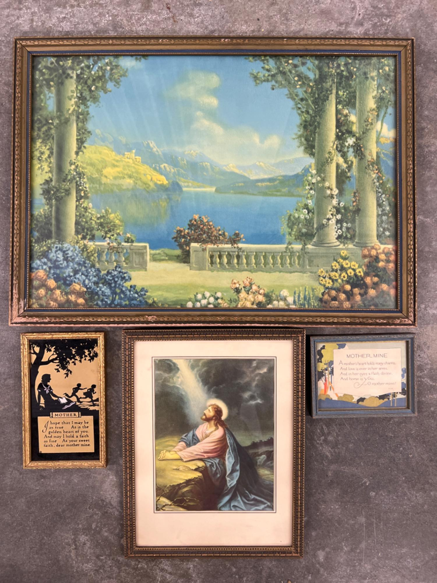 Striking lake scene in this vintage print. 21” x 15.5” Jesus praying in Gethsemane. 13” x 10” Vintage black silhouette on gold “Mother”. 7.5” x 4.25” Mother Mine framed poem 6” x 4.5”