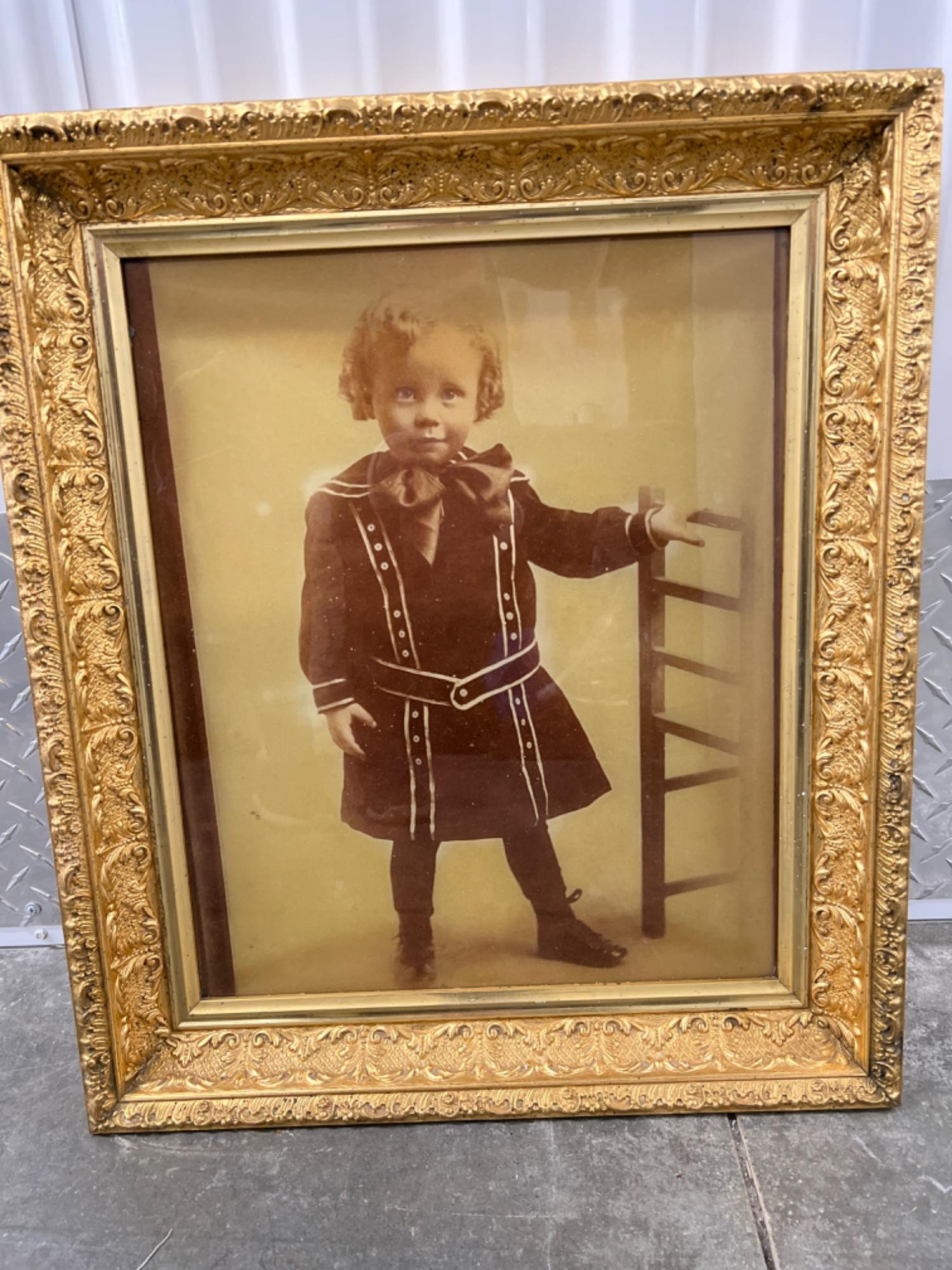 Ornate gold gild frame with portrait of an early 20th century New York girl. Size of frame 18" x 21" x 2".