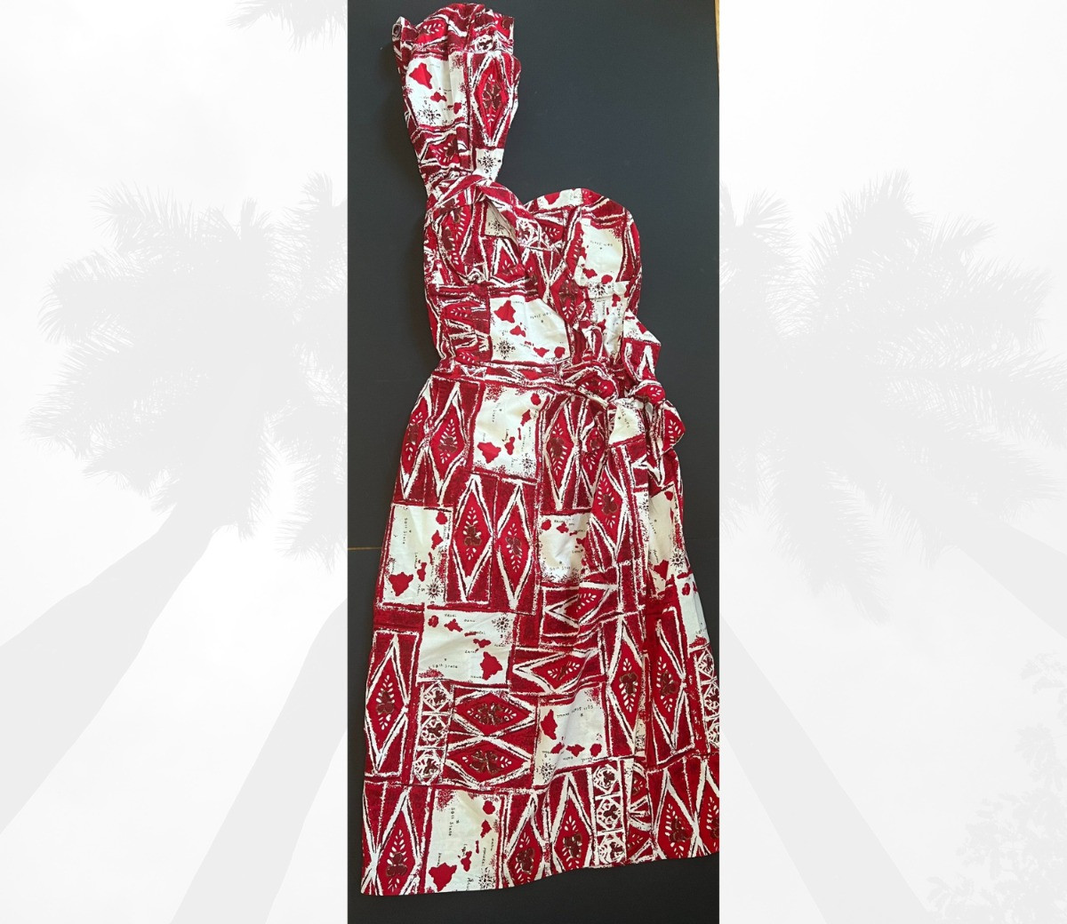 Alfred Shaheen welcoming Hawaii as the 50th state celebration cotton dress with sarong that attaches at one side. Zips up back. Fabric is pewter and crimson & currant reds on cream background. Size fits extra small with measurements at approximately: Bust 30"; Waist 22"; Hips up to 30-32"; Length is 24" from the waist.