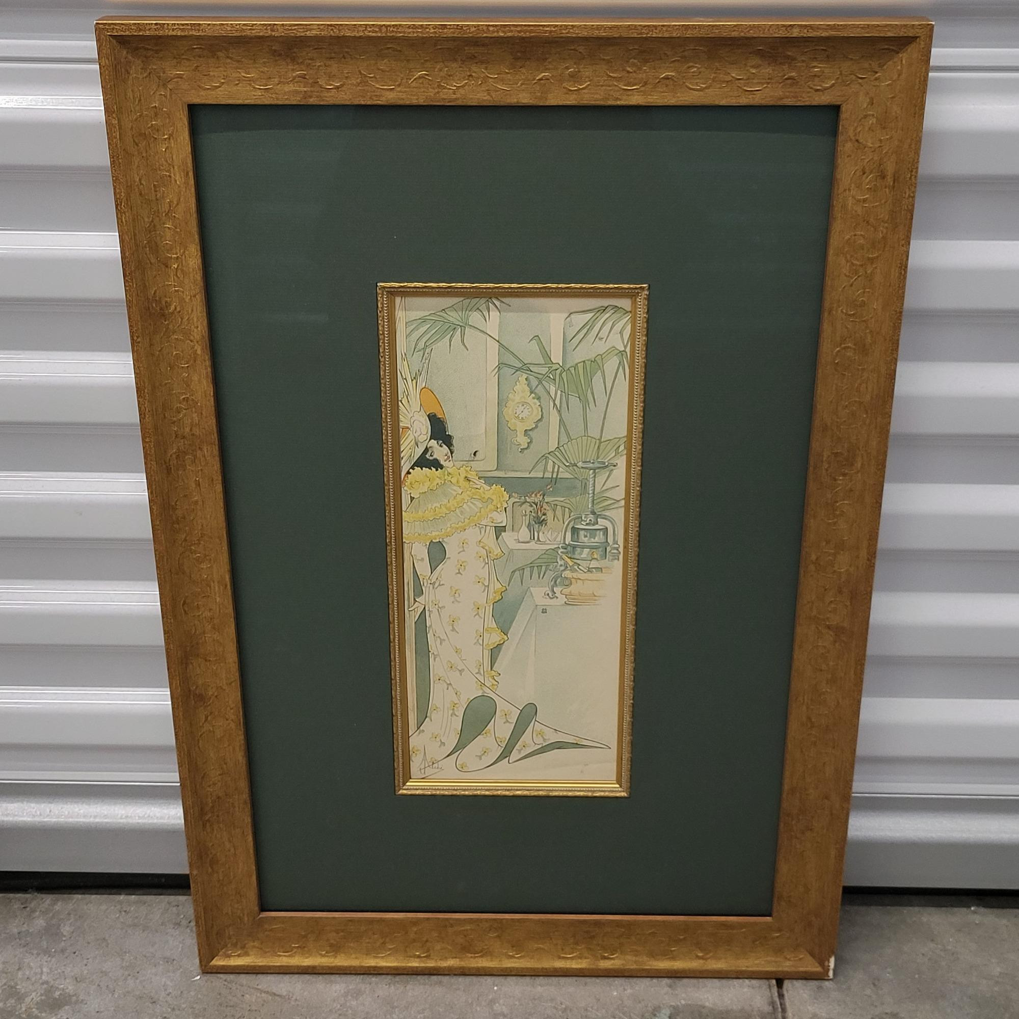 Gold gilt wood frame, lovely 1920-30's deco woman signed print. 18" x 26".