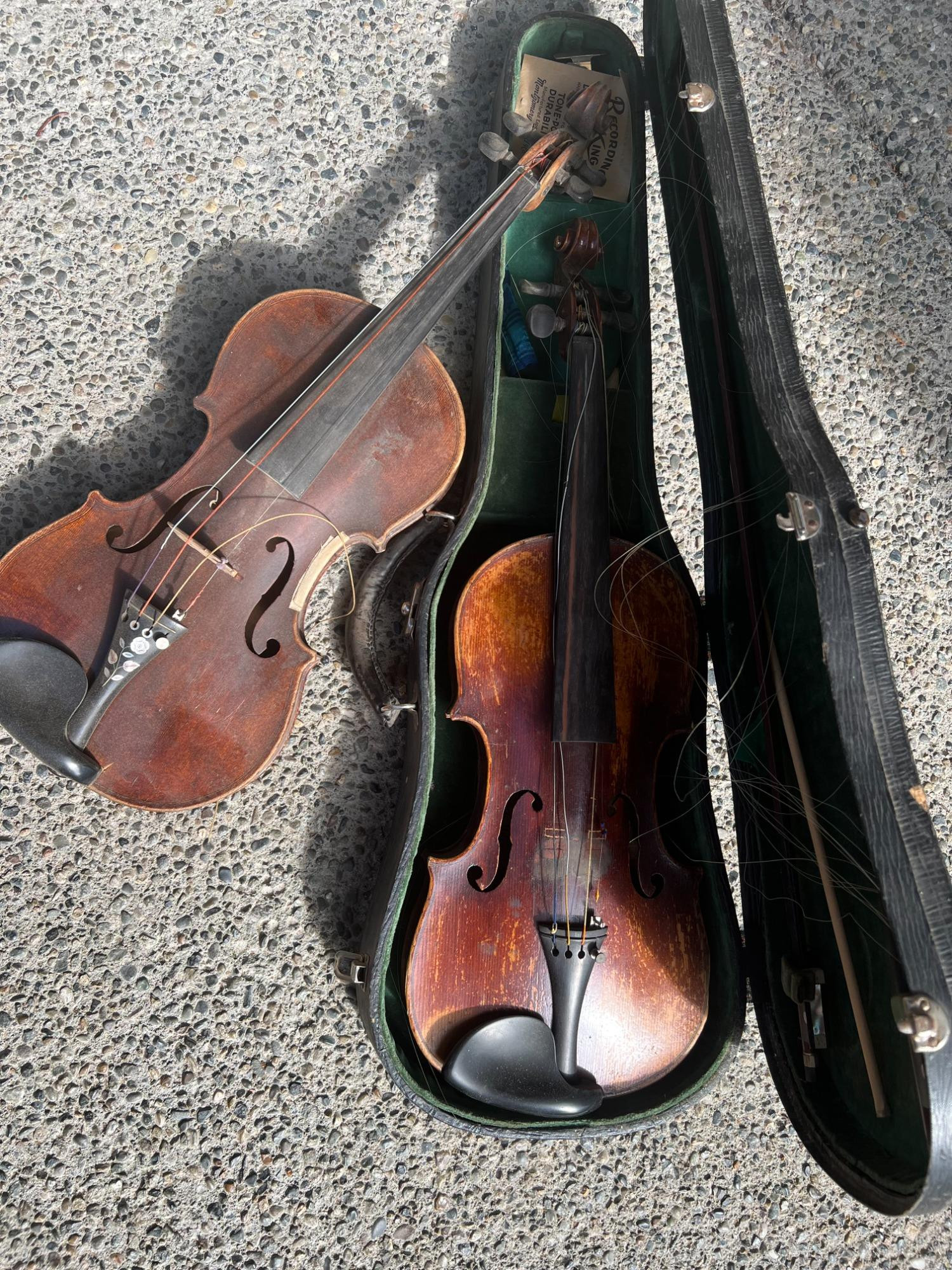 Violins are shown as found. One has a sticker inside that says, "Copy of Francis Ruggeri". Lots of case candy inside along with two bows that need to be restrung. The other violin is in a case and is unmarked. Potentially a student violin. Good wood structure and stain does not show as much wear. Case candy inside, as well.