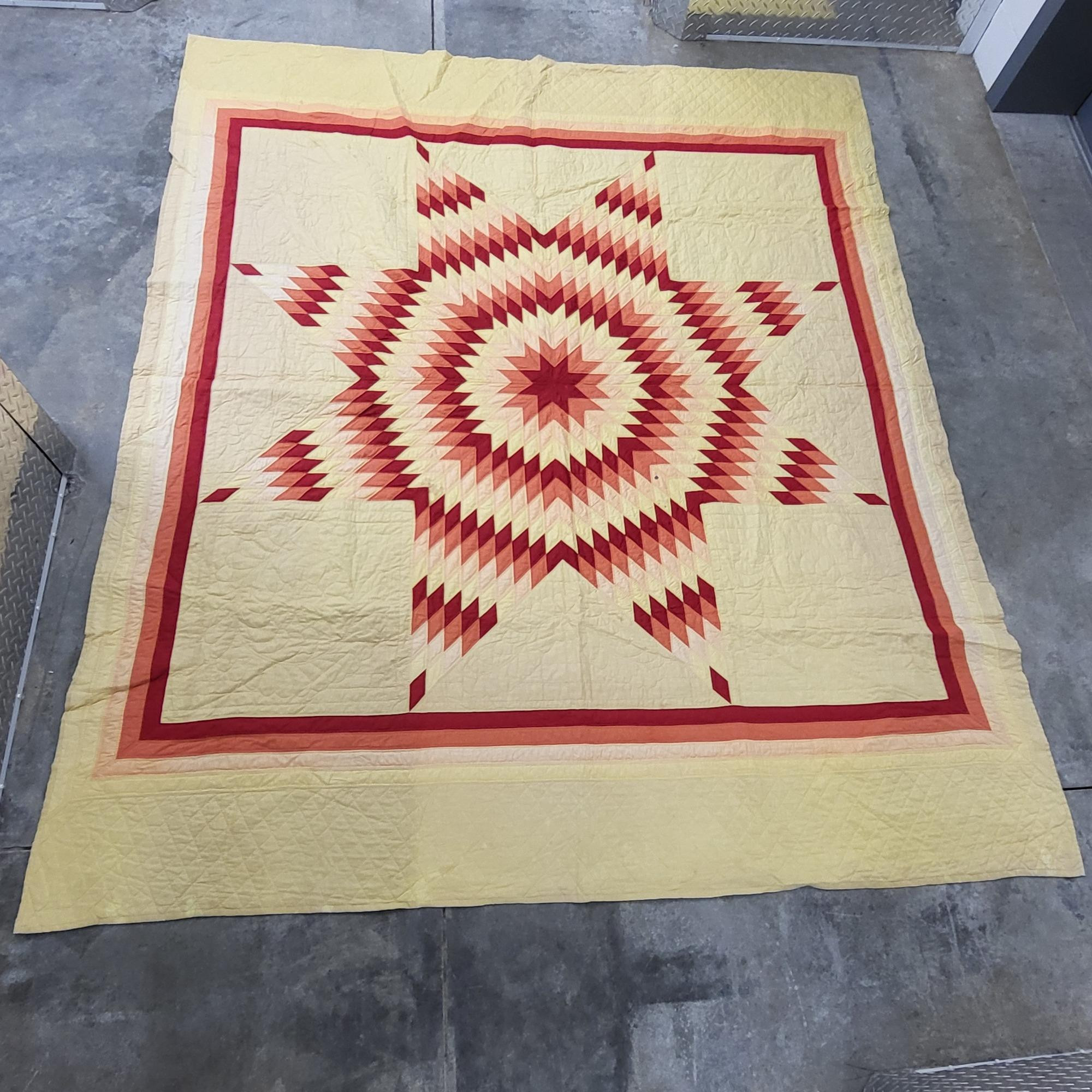 Hand stitched antique quilt often patterned by the Pennsylvania Dutch. This quilt is a rare find. Sunburst pattern made of triangular pieces with yellow background. Quilt measures 78" wide x 91" long. Please note some minor staining.