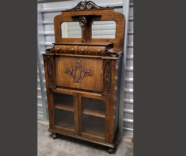 Unique wood grain on this solid genuine antique secretary desk. Measures 69" tall x 35" wide x 12" deep. Drop front door pulls down to a desktop and many compartments to keep organized. The hinges do need to be reattached but the hardware is there. There is two skinny drop down doors on either side to make the desk surface wider and compartments keep files tucked away. The bottom section is a bookcase with two glass doors. Top has two beveled mirrors, a small decorative center shelf, two rounded front drawers with brass pulls and carved sides. The decorative carvings and detail throughout, make this piece a very attractive, elegant piece of heirloom furniture. Note the left leg is not attached and will need repair but is present. Extra care will need to be taken when moving this beauty! Bidding on this lot is an agreement that: (1.) You