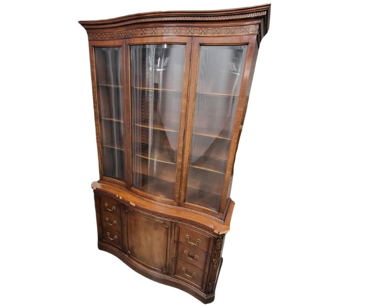 Antique mahogany two piece hutch. Exquisite carvings throughout, bow and beveled front glass, three panes. Center glass door opening. Six drawers with dovetail joins. Bottom center door. Brass pulls. Overall Measurements 48.5" long x 75.5" tall (both pieces) x 16.5" deep. Some of the veneer has chipped off along bottom edge of upper hutch (see all photos). The bottom piece is numbered 579/5/49. Top piece 1085 China Genuine Mah 5F. The bottom part of hutch is open. Bidding on this lot is an agreement that: (1.) You will have 2 capable, able-bodied persons to lift and load at a minimum. (2.) You will bring a hand truck and/or any other tools needed to remove this item. You will bring your own moving blankets, or wrap to protect against damage. If these steps are not followed your item will be forfeited and no refund given.