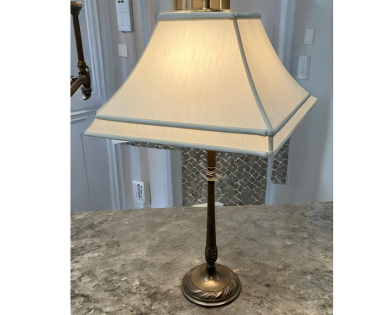 Brass tabletop lamp in working condition with squared shade. 24" tall. Shade is 16" x 16".