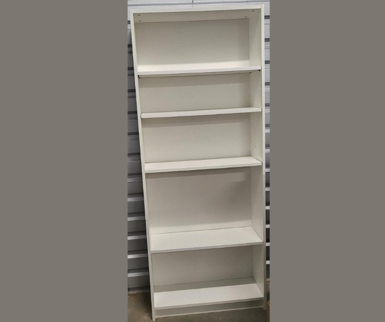 White thought to be IKEA bookcase with five adjustable shelves. Measures 32" wide x 79" tall x 11" deep. There is a hole on the top left side where a screw was inserted to attach to a secure wall or other stationary surface. Small patch of paint loss on inside of one shelf area. Bidding on this lot is an agreement that: (1.) You will have 2 capable, able-bodied persons to lift and load at a minimum. (2.) You will bring a hand truck and/or any other tools needed to remove this item. You will bring your own moving blankets, or wrap to protect against damage. If these steps are not followed your item will be forfeited and no refund given.