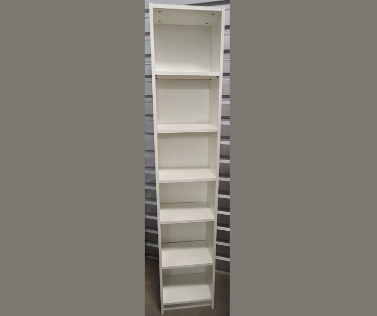Thought to be a white IKEA bookcase with five adjustable shelves. Slender width. Measures 16" long x 79" tall x 11" deep. There is a screw hole on the top right side that held a screw for the purpose of anchoring to a stationary wall or to hold two like bookcases together. Bidding on this lot is an agreement that: (1.) You will have 2 capable, able-bodied persons to lift and load at a minimum. (2.) You will bring a hand truck and/or any other tools needed to remove this item. You will bring your own moving blankets, or wrap to protect against damage. If these steps are not followed your item will be forfeited and no refund given.