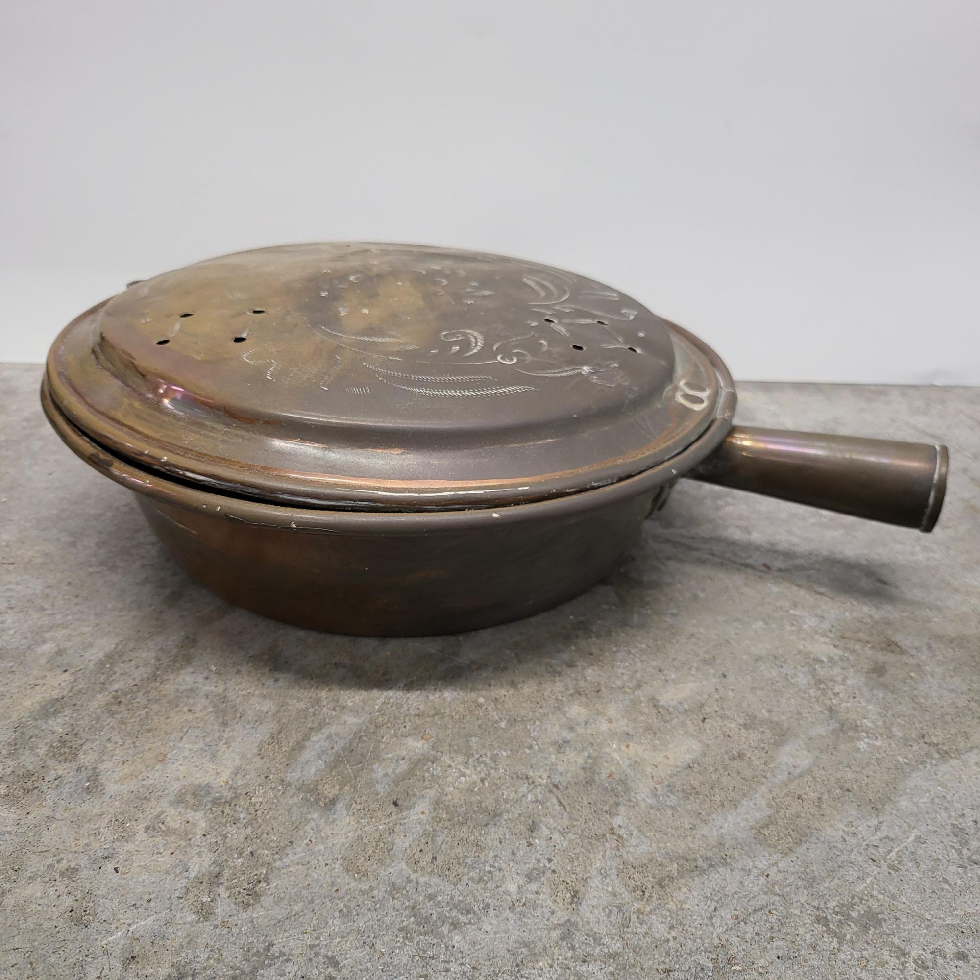 Antique, rustic copper bed warming pan with handle. Etching on top of the lid. There is a small ring to lift open the hinged lid. It measures 12" round x 3" tall.