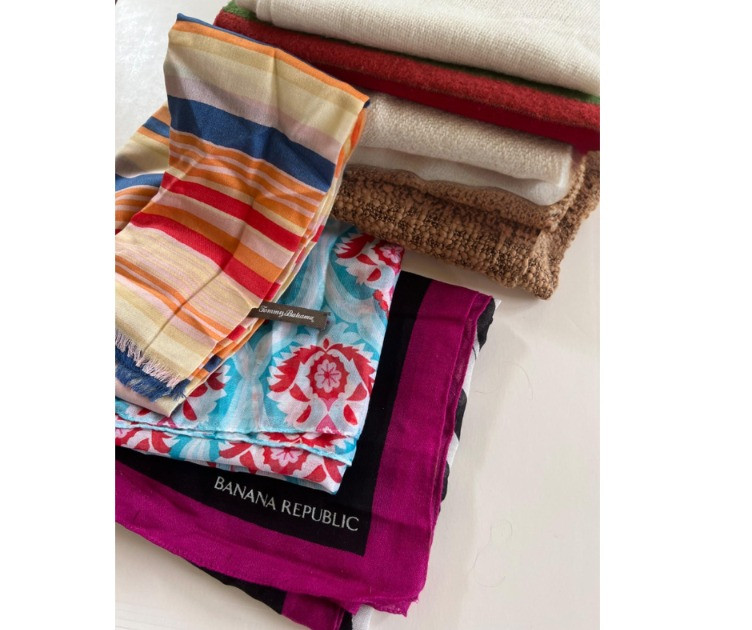Banana Republic Bow Design Scarf -42” x 40” wool and silk. Karma light blue and red 19” x 48” Tommy Bahama 16” x 66” 3 knot scarfs with fringe 1 felt scarf - handstitched