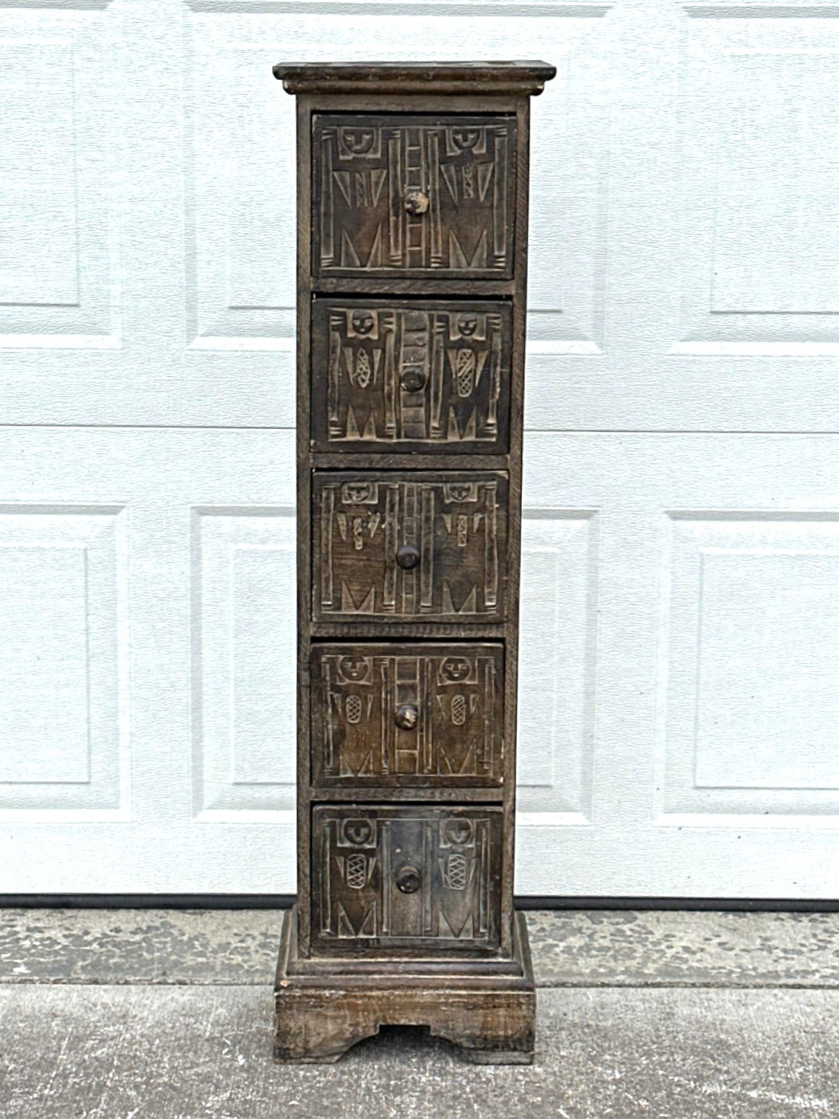 Carved Wood Indonesian Cabinet - 5 Drawers Please note top has crack, and there is a couple lighter spots. Overall good usable condition.