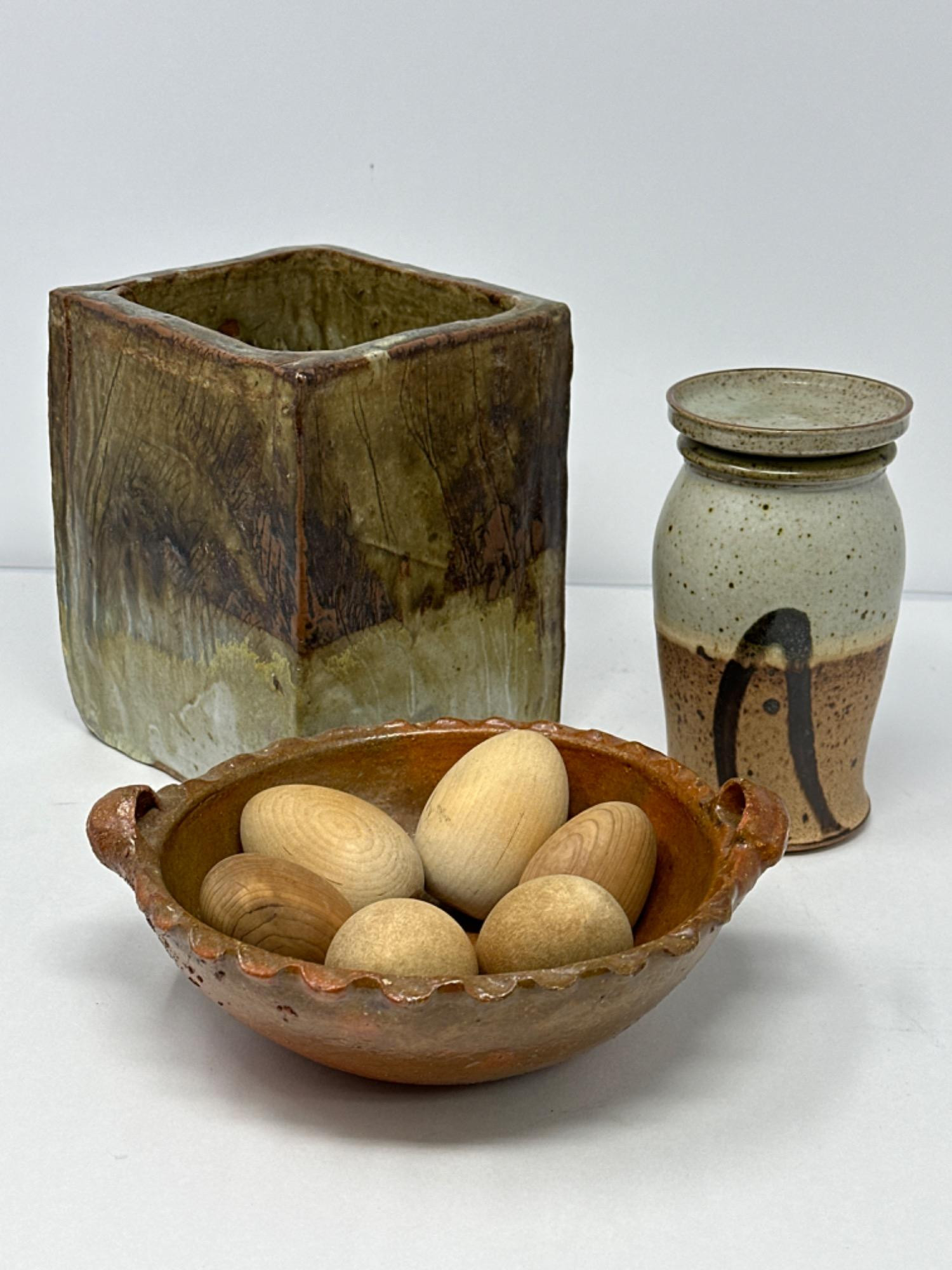 Lot # 50 - Vintage Pottery- Pie Crust Bowl, Glazed Utensil Holder & Jar