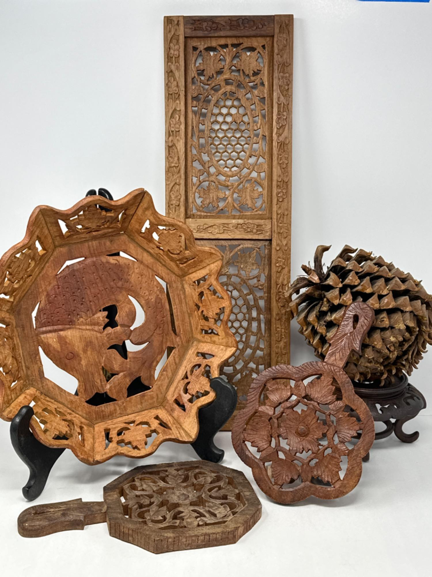 Vintage Carved Wood Pieces & Large Coulter Pine Cone *please note photos carefully for more details & condition