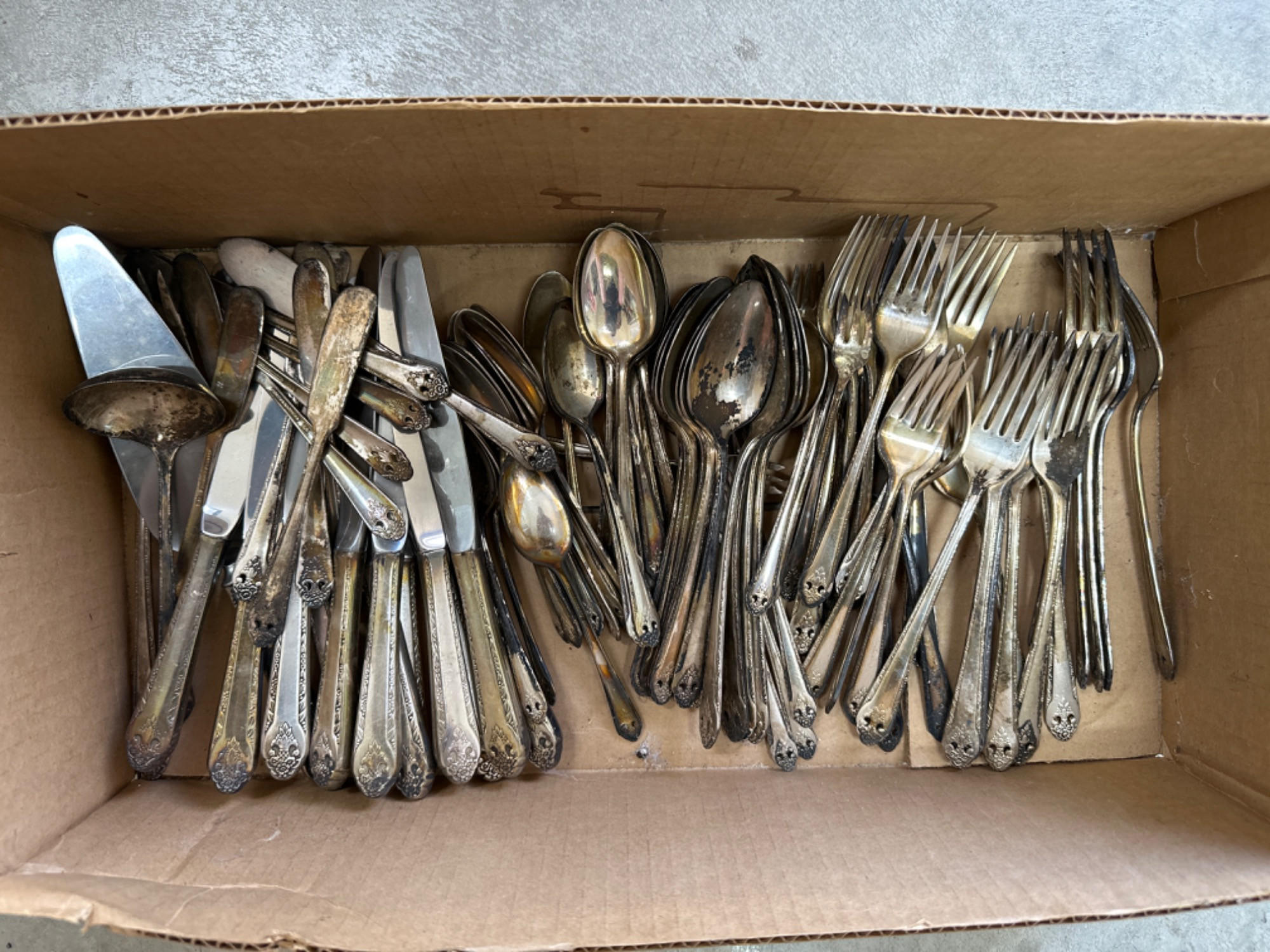 Vintage Holmes & Edwards Silverplate Flatware In need of polishing, or use as a craft project Last picture shows an idea of what's in the box