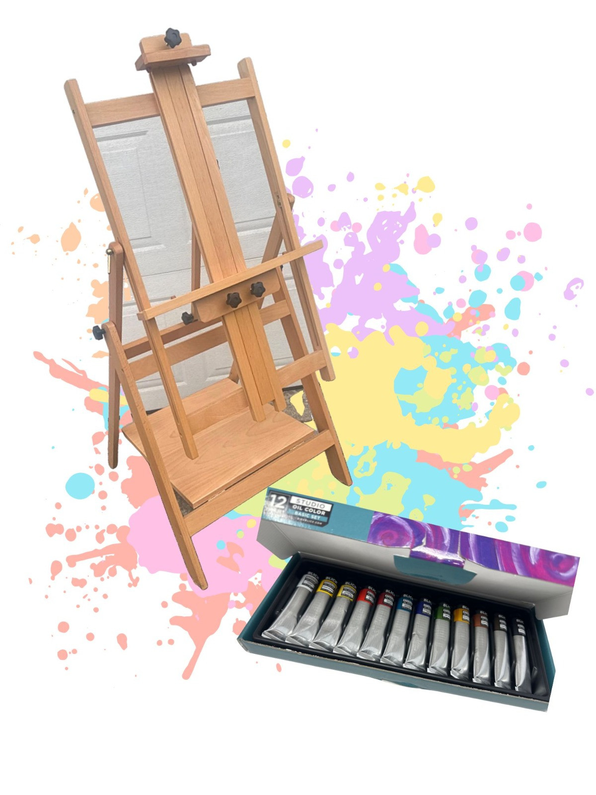 Easel- 55” H x 24” W x 25 3/4” D + Box of acrylic and oil paints and pans