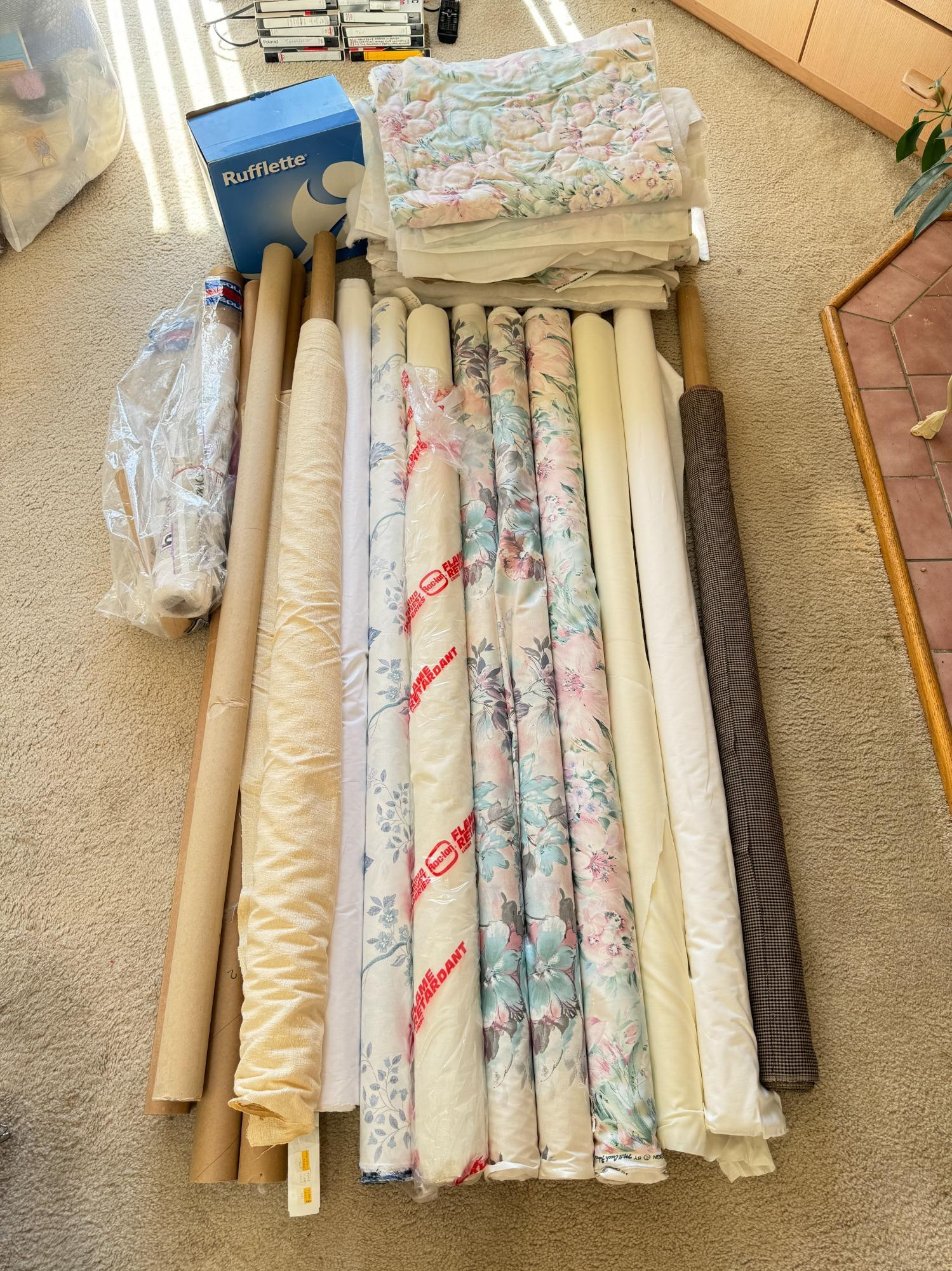 Large Bolts of Fabric Postmodern Pastel Florals - 2 of matching and 1 similar. Also includes several pieces with upholstery batting 4 tubes with no fabric included Good condition, smoke free home