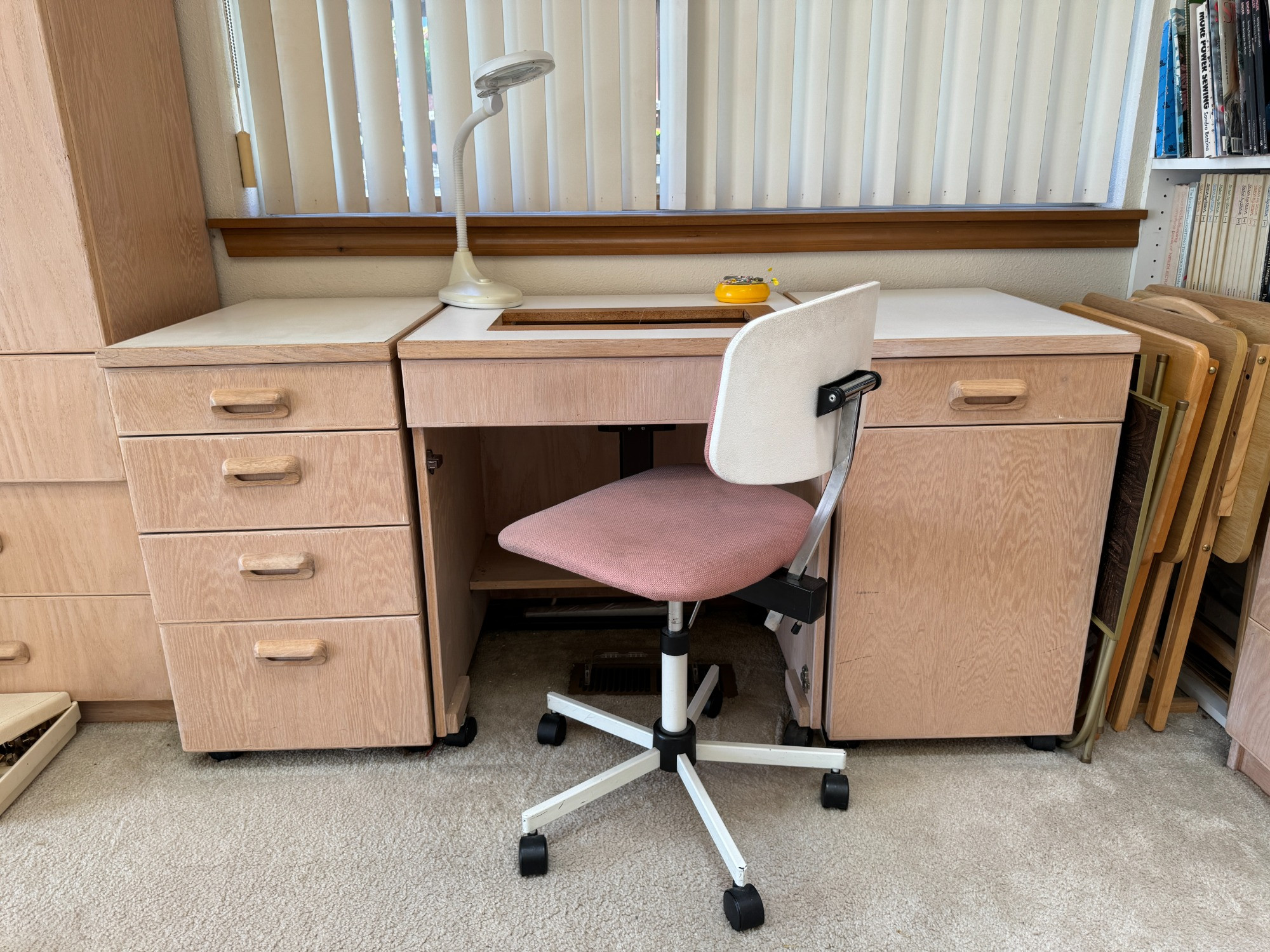 Vintage 3 Piece Sewing Table w/Rabami Danish Office Chair & Magnifier Light Wood with white laminate. (2) Smaller side cabinets measure - 23 1/8 inch deep by 16 5/8 x 29.5“ tall. One side is a 4 drawer cabinet. Other side has one drawer with a hideaway serger desktop Center desk is 26 1/8 inch wide by 23 1/8 inch deep - Door has broken off. Needs new hardware to attach. RABAMI made in Denmark office chair - cracked on the back, fabric is dirty.
