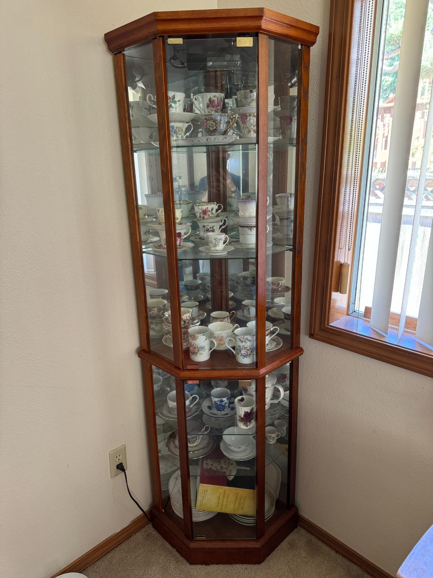 (2) Corner China Cabinets - Cabinets Only Stacked on each other. Mirrored backs with glass shelves. Top cabinet is lighted - 23.5" x 39.25“ tall Bottom cabinet is not lighted - 23.5" x 30.75"T Projection from corner on both is approximately 20.5"