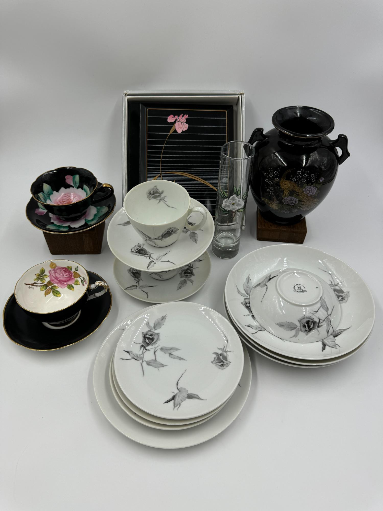 Variety of Continental Jet Rose China pieces Adderley teacup and saucer Clear Vase is 6.75”T New in Box Black lacquered photo album and more