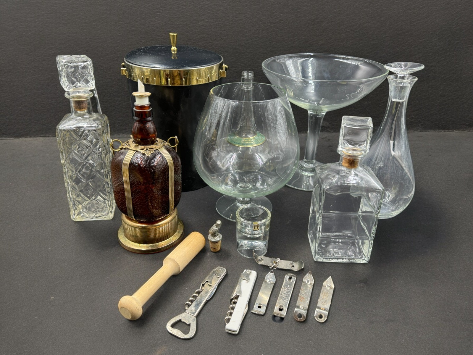 Three tiered decanter has a small chip on stopper - 9.5” T overall Music box brown glass decanter plays when lifted - 9.5”T to the neck without stopper Large martini glass 10.5”T x 10”D Pewter owl stopper Vintage Bottle/Can openers Cascade England Jigger and more