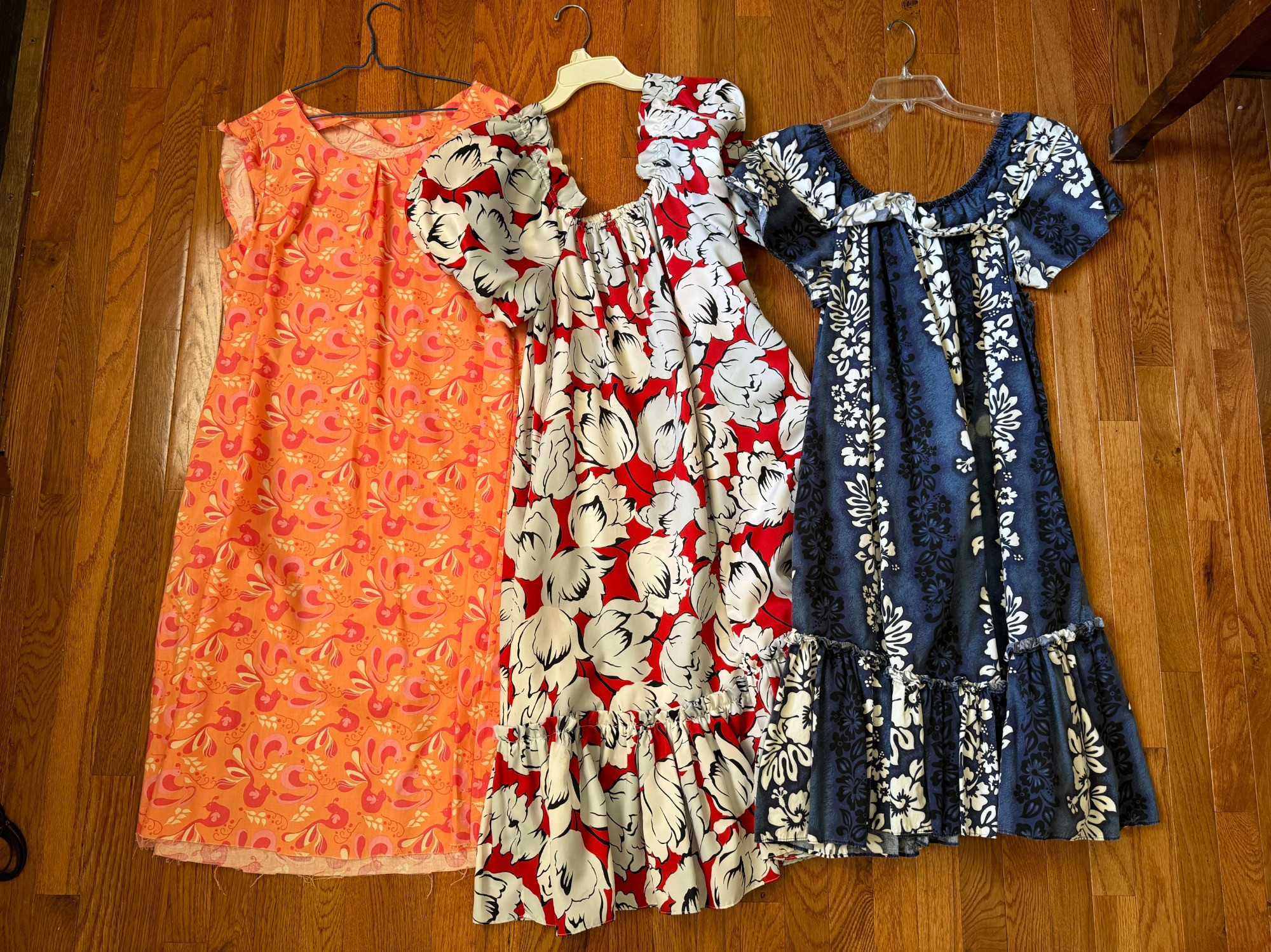 Vintage Hawaiian MuuMuu Dress Trio - Aloha Mo'i & T&L Muumuu Factory Aloha Mo’i Hawaii Blue White Hibiscus Dress Blue - Vintage size Large (medium todays size) Handmade orange dress approx 42" bust - needs bottom hemmed T&L Muumuu Factory Red dress - Unknown size, approx L