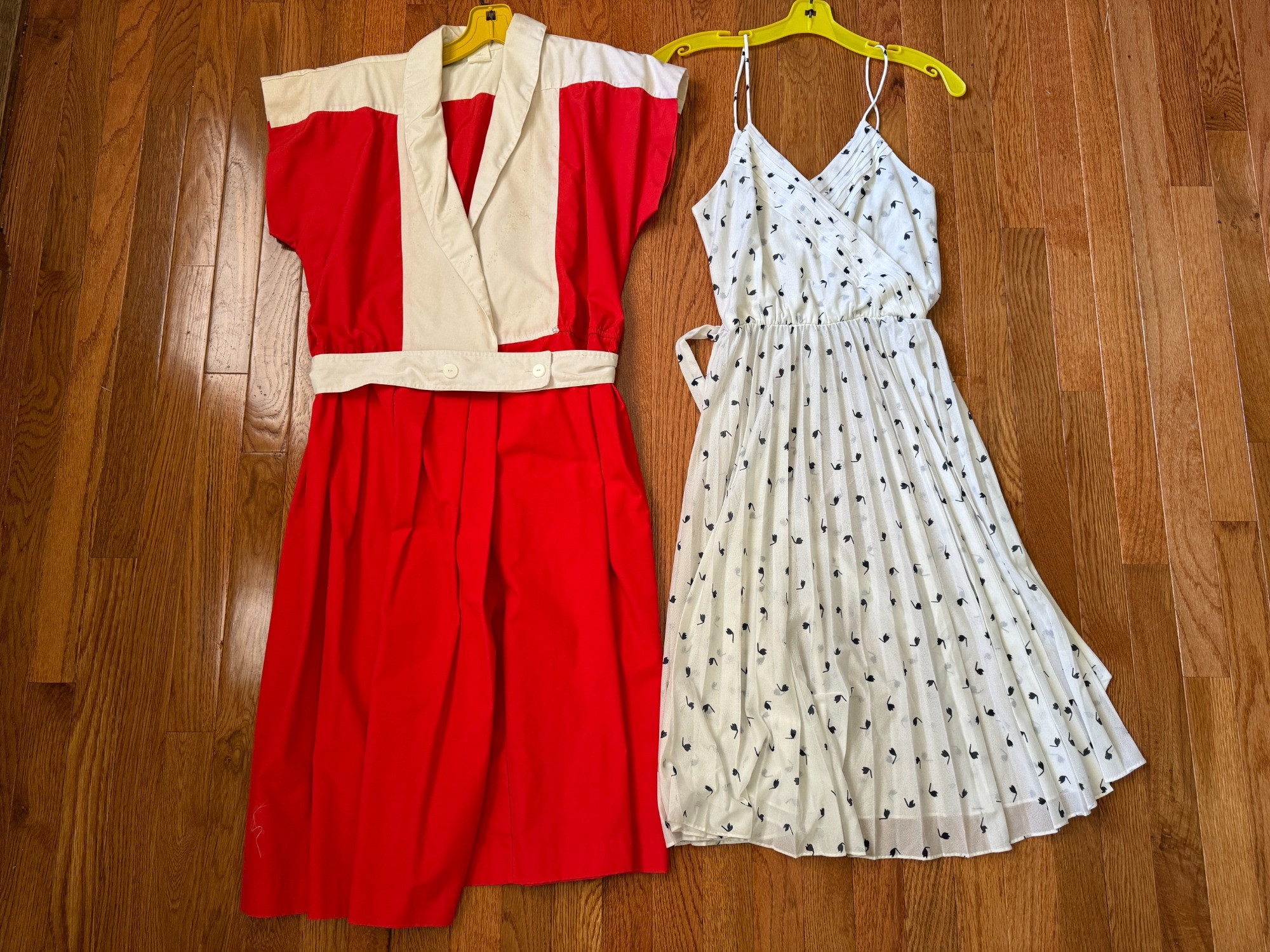 Cherry red & white dress - Vintage size 12 - needs stain treatment Spaghetti strap white and blue dress - stretchy material. Bust is 32" max, waist 24 to 28 due to stretch