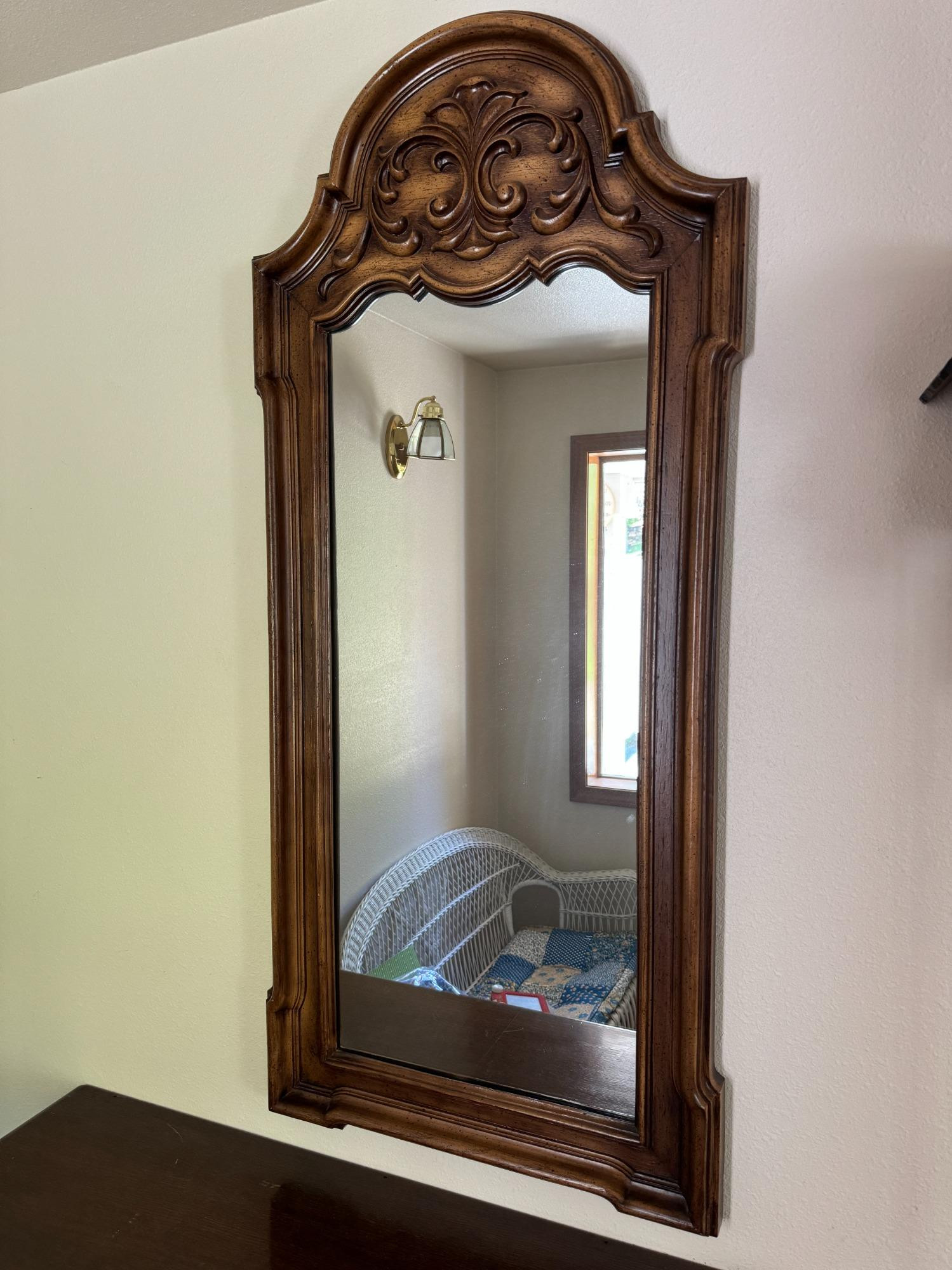 Vintage 1970s Composite Faux Wood Ornate Mirror Measures: 51"T x 22.75"W with a projection of about 2 inches