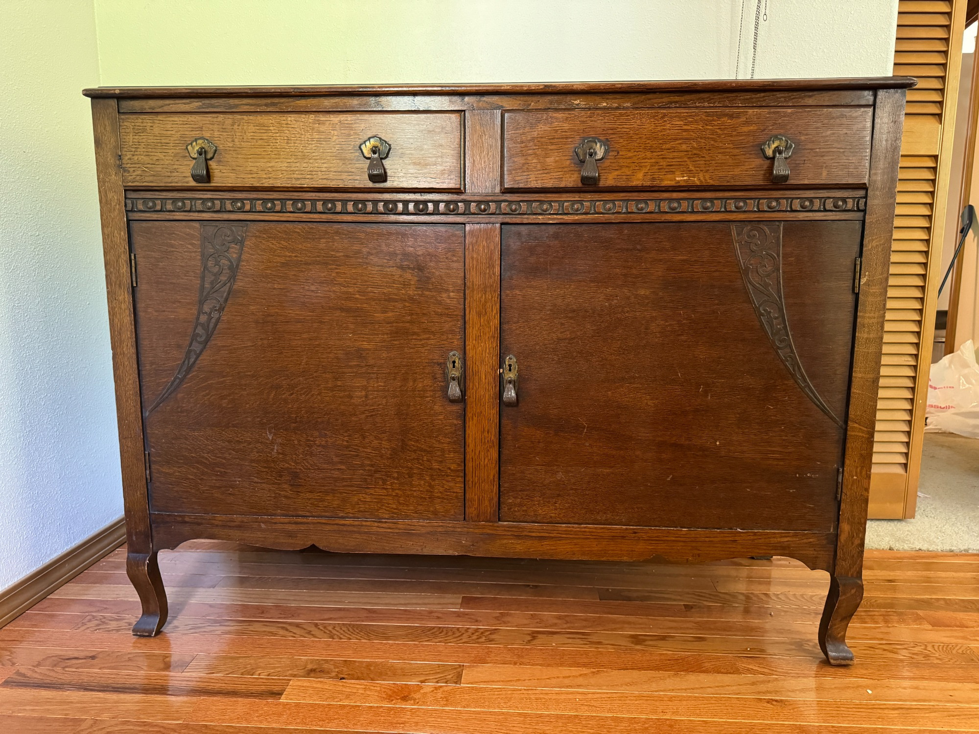 Antique Sideboard Buffet w/ Pressed Wood Details & Original Hardware Measures: 48" x 19" x 35.75“ tall Beautifully crafted, has dovetailed drawers. Some wear and a repair to the top back. Contents NOT included Bidding on this lot is an agreement that: (1.) You