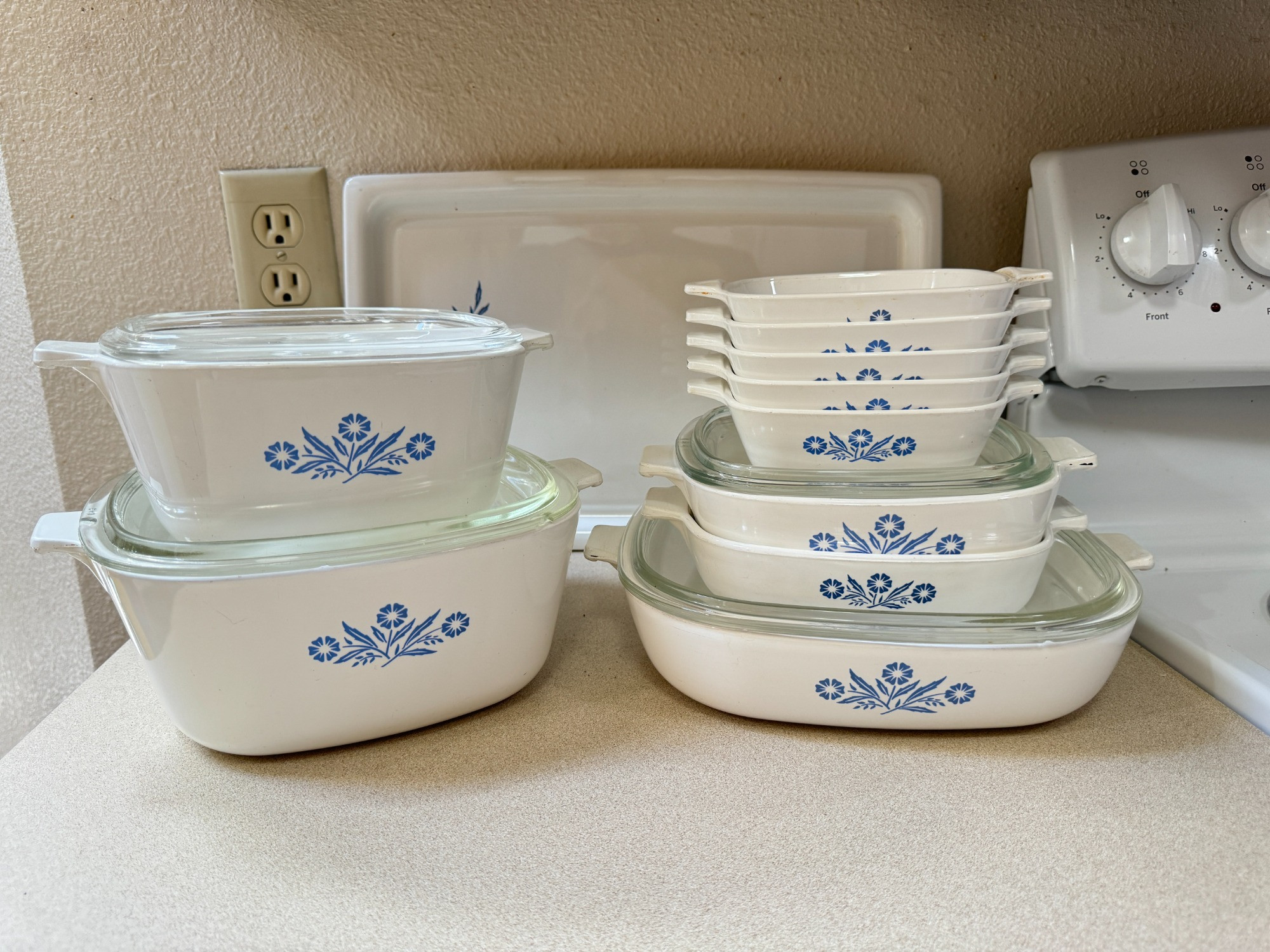 Corning Ware Cornflower Casserole Dishes & Hotplate Largest pan has a chip under the handle. Majority of the glass lids have chips Hotplate is missing a leg. Cord was found later.