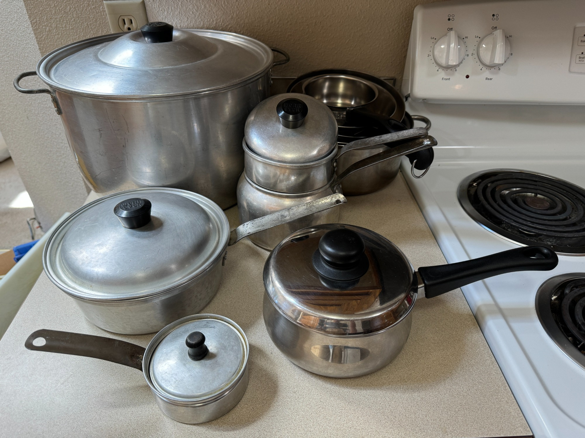 Vintage Aluminum Cooking Pan Assortment Egg Poaching Pan Double Boiler Large 13"D Stock pot and more