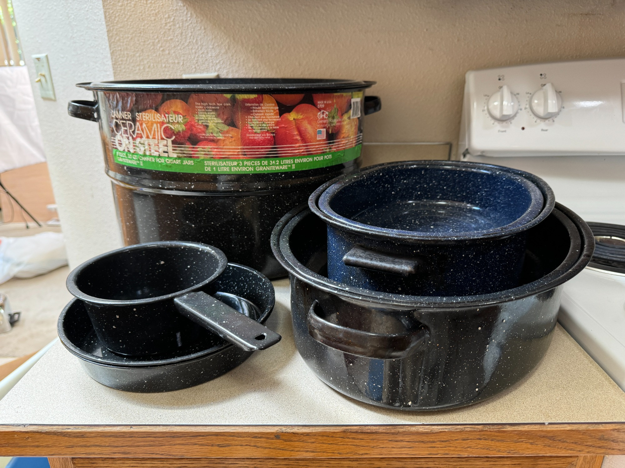 Largest piece is a canner sterilizer - three-piece 33 quart canner for quart jars Smallest is a vintage 5 inch saucepan (2) Made in Japan Vintage 8"D pans Roaster pans - Smaller blue 13.5"L, larger black 16.5"L - blue pan shows the most wear