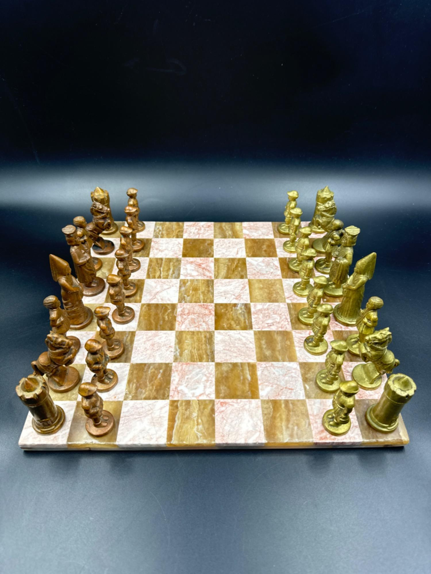 Vintage Onyx Chess Board + Heavy Cast Metal Figural Chess Pieces 14 inch board - great condition Pieces measure approximately 2.75" to 4.25“
