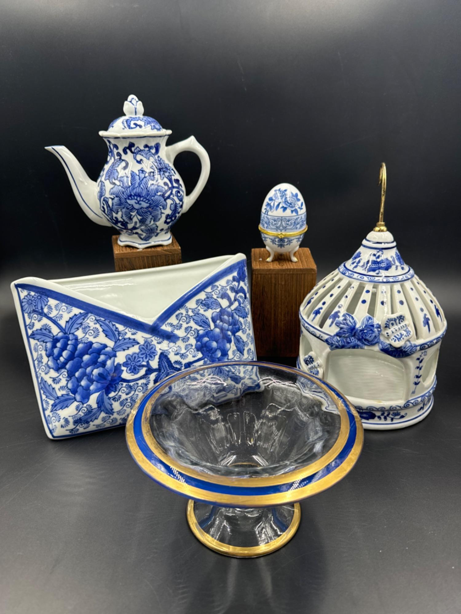 Vintage Blue & White Porcelain Formalities by Baum Brothers porcelain cage - 10“T x 6“D Vintage Asian Blue & White Floral Design Desk Mail Letter Holder Seymour Mann Blue and White Porcelain Teapot 6.5 inches tall Decorative egg - 4 inches tall Blue & gold glass dish 7"D - wear to the gold paint