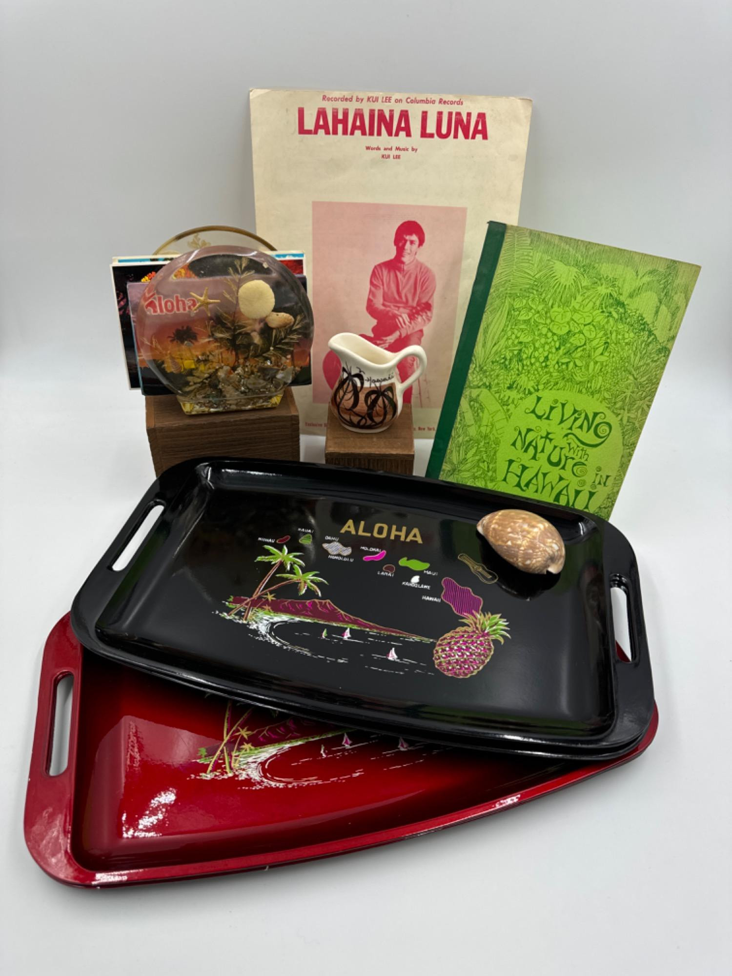 RL Dancy Army and Navy photographer 1920 Honolulu from the air Photograph in frame 36" x 10.75" (4) Made in Japan Lacquer trays 15.5" x 9.5" Plus postcards, Pohaku Kiln pottery, Living with Nature book, sheet music and more